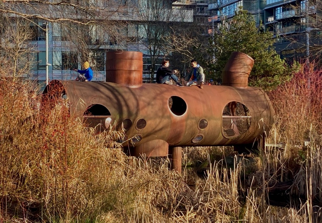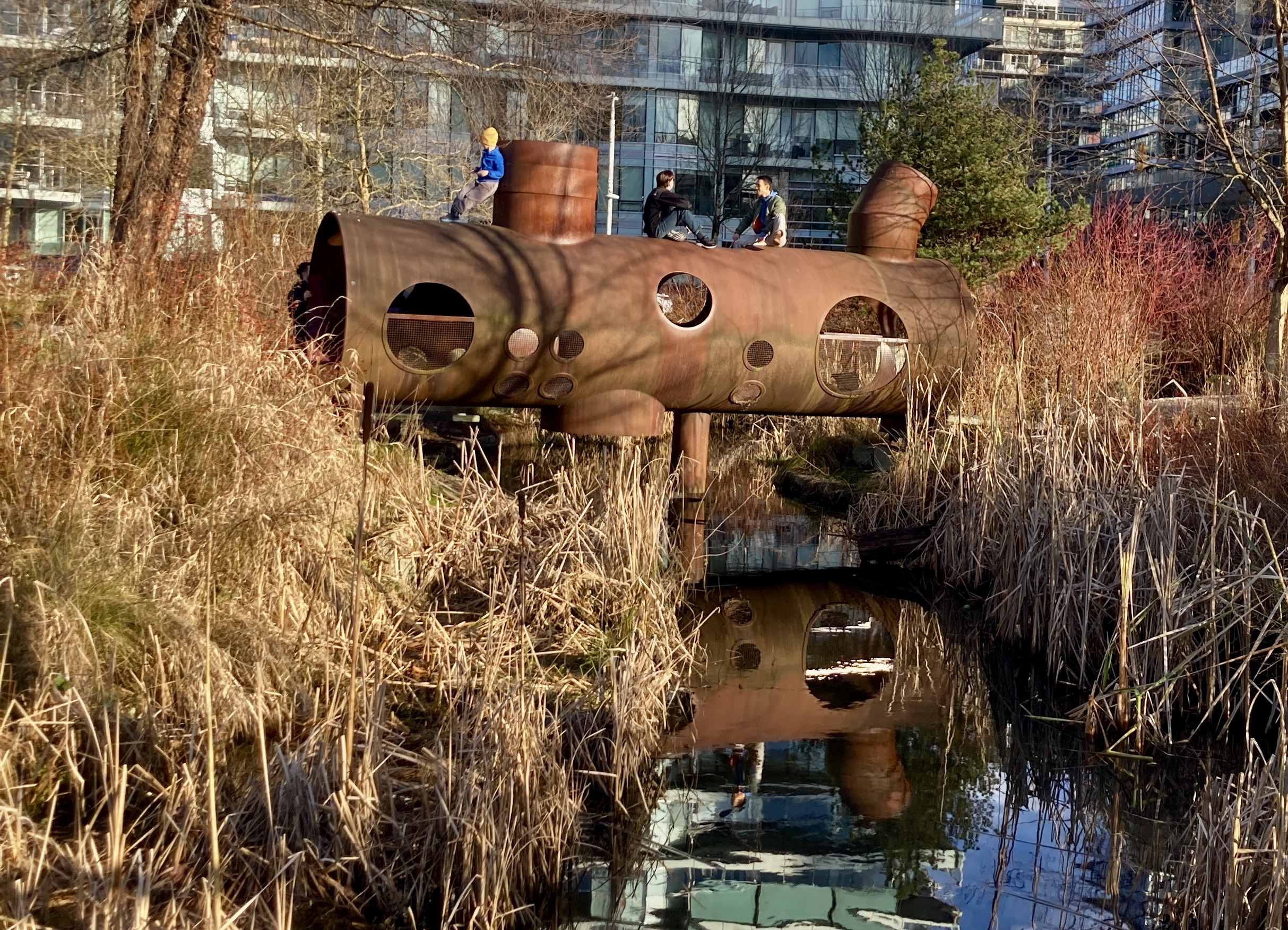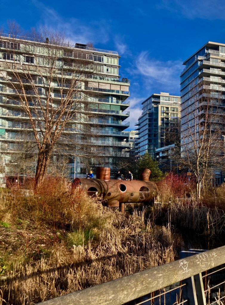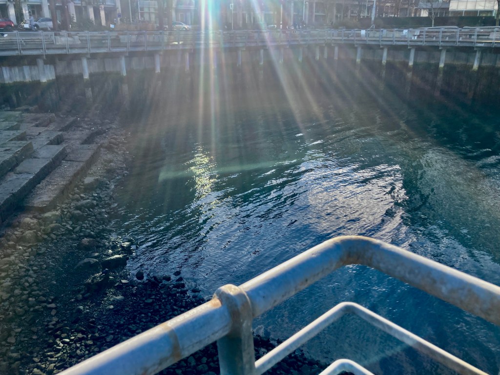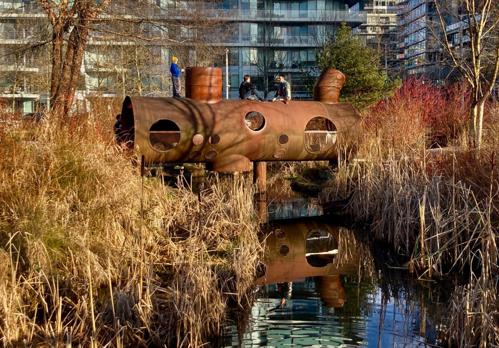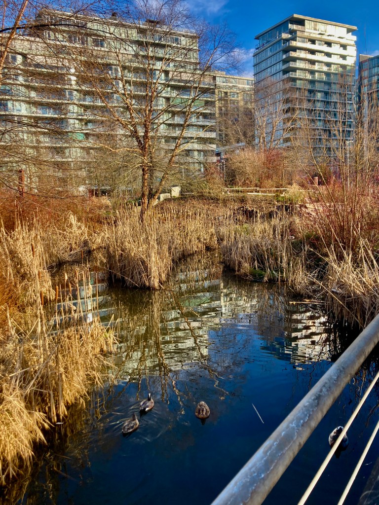 I stand at the heart of the bog, admire its waters at their full winter strength, surrounded by bog plants and mosses and, beyond that, the forest of Pacific Spirit Regional Park.