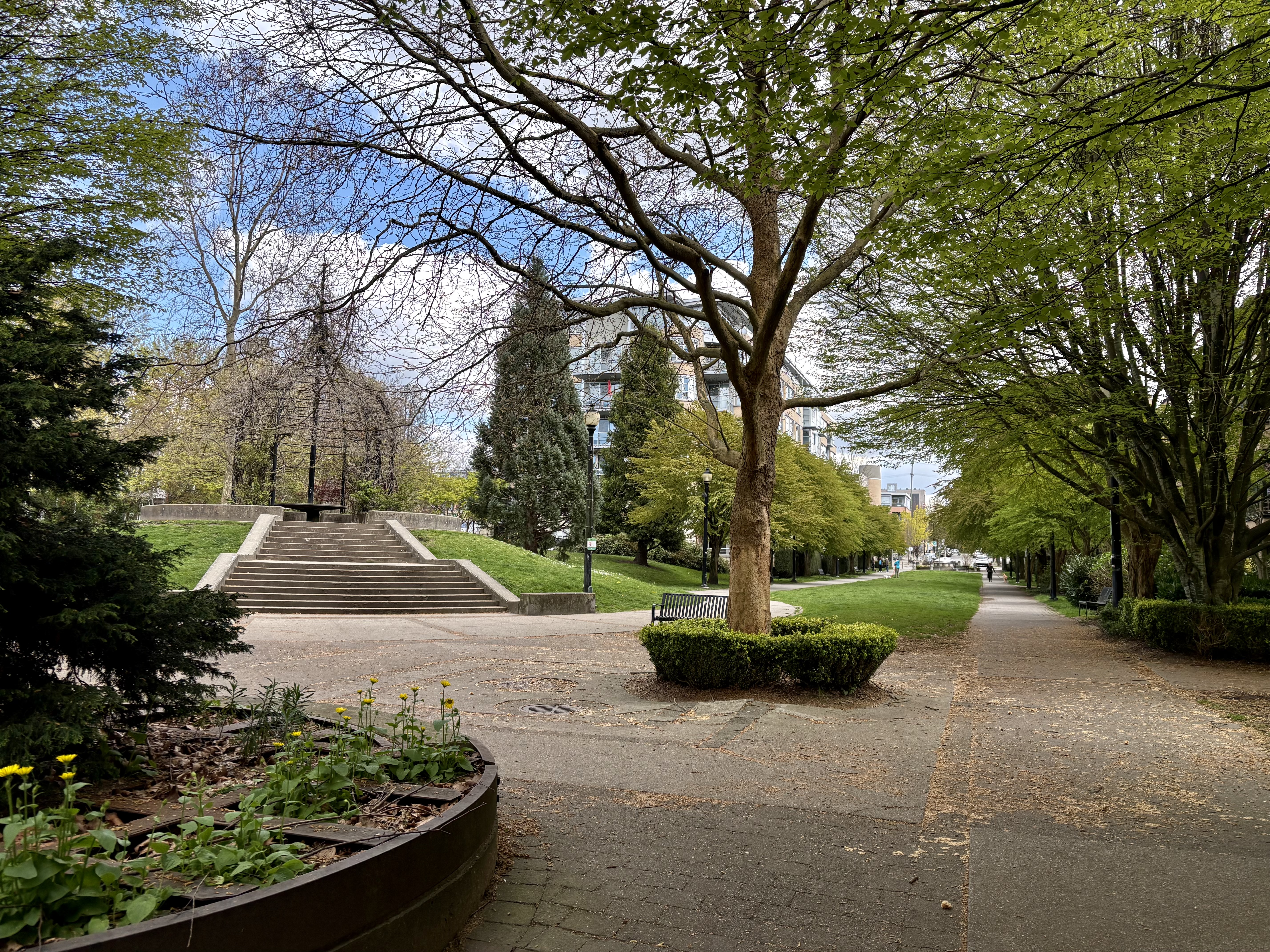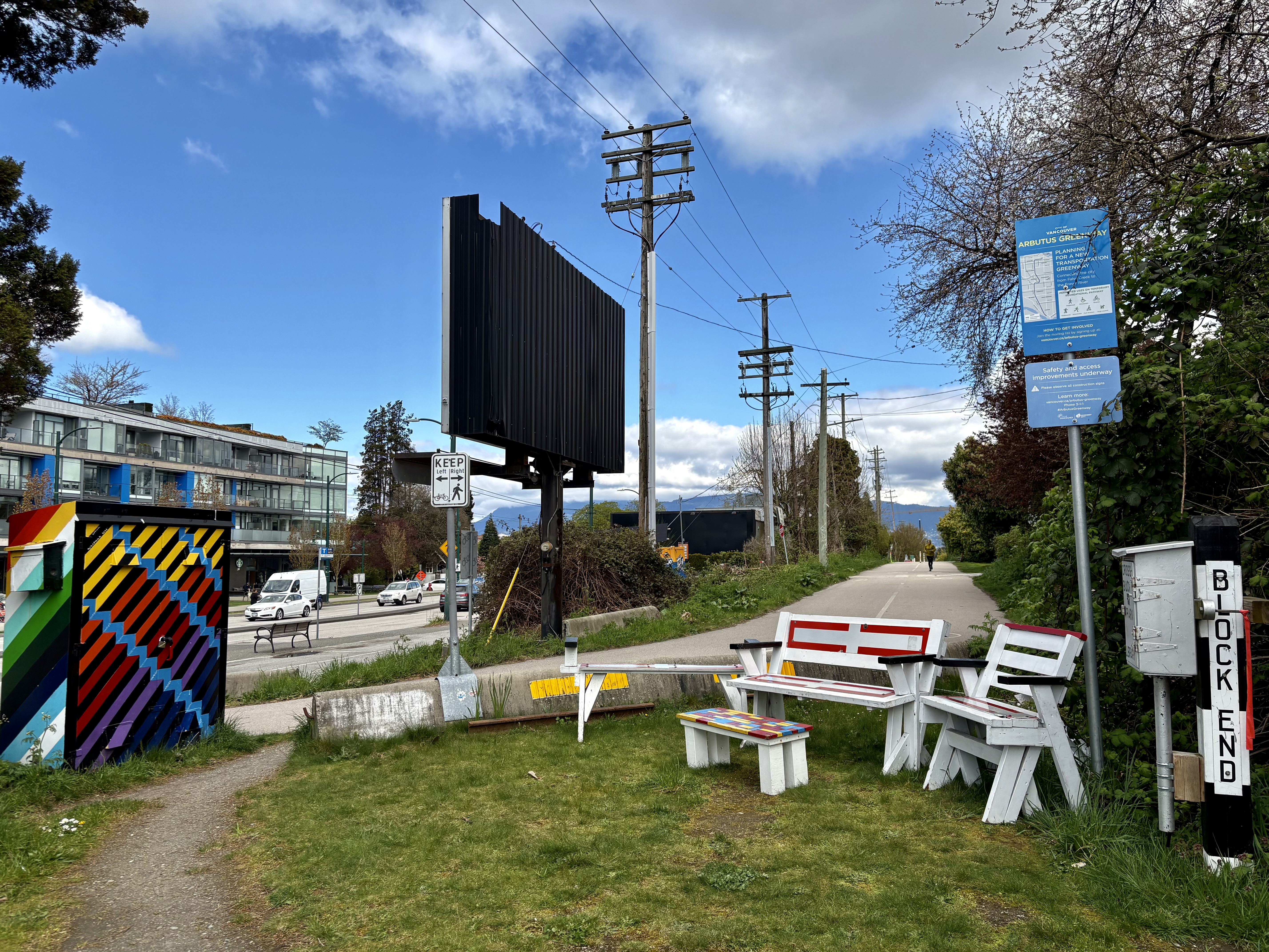 The pedestrian trail, separate from the biking trail, is gravel, liberally supplied with benches, and sometimes, as here, quite broad.