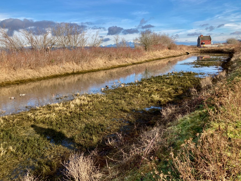 Sparkling water in the canal as well, with (I think) American Wigeon ducks paddling their way toward that red cabin beside the controls that regulate water levels.