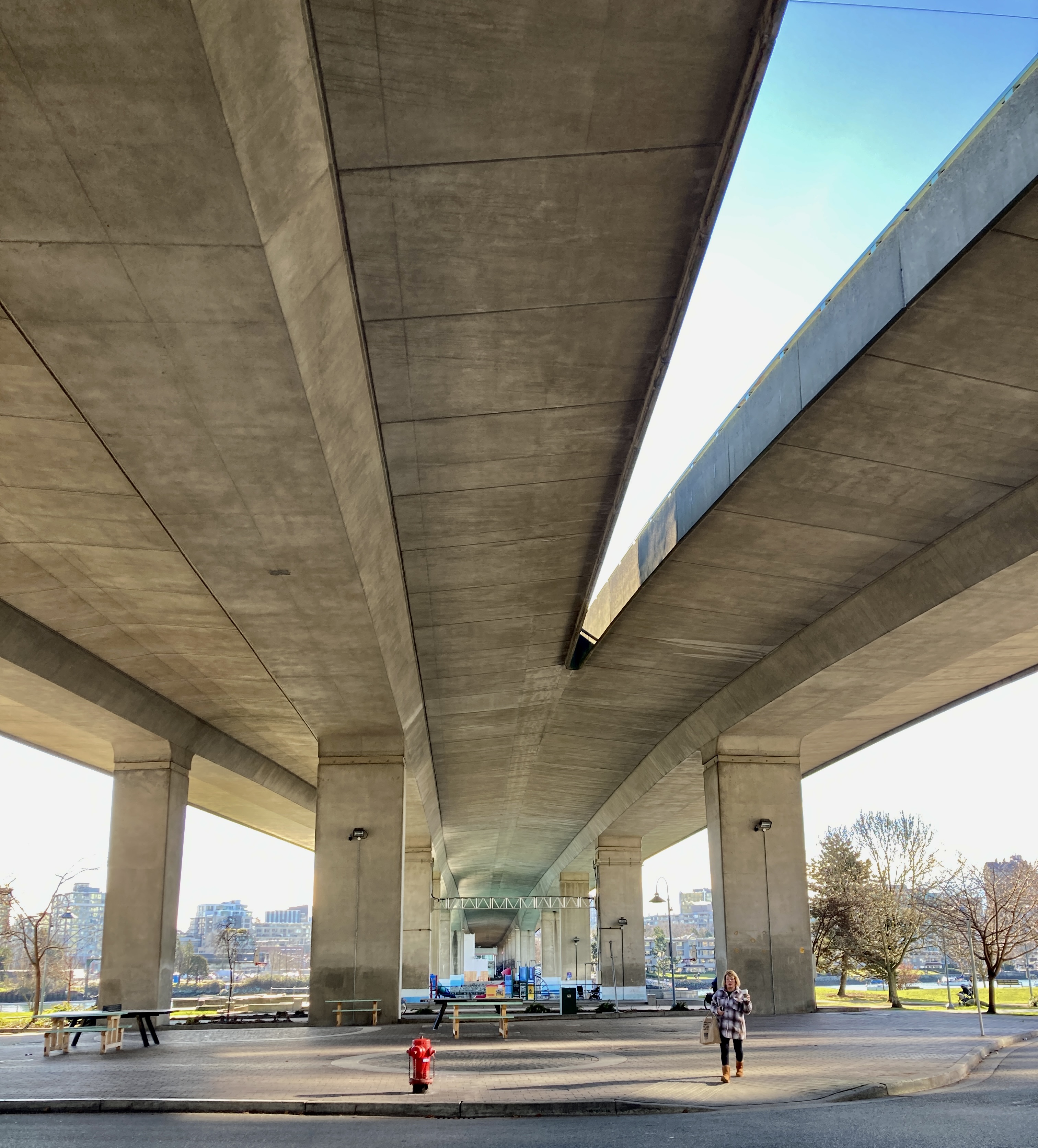 I’m on the north side of False Creek, under access ramps for the Cambie Street bridge. I look up and there it is, right before my eyes, visible and tangible. Geometry.