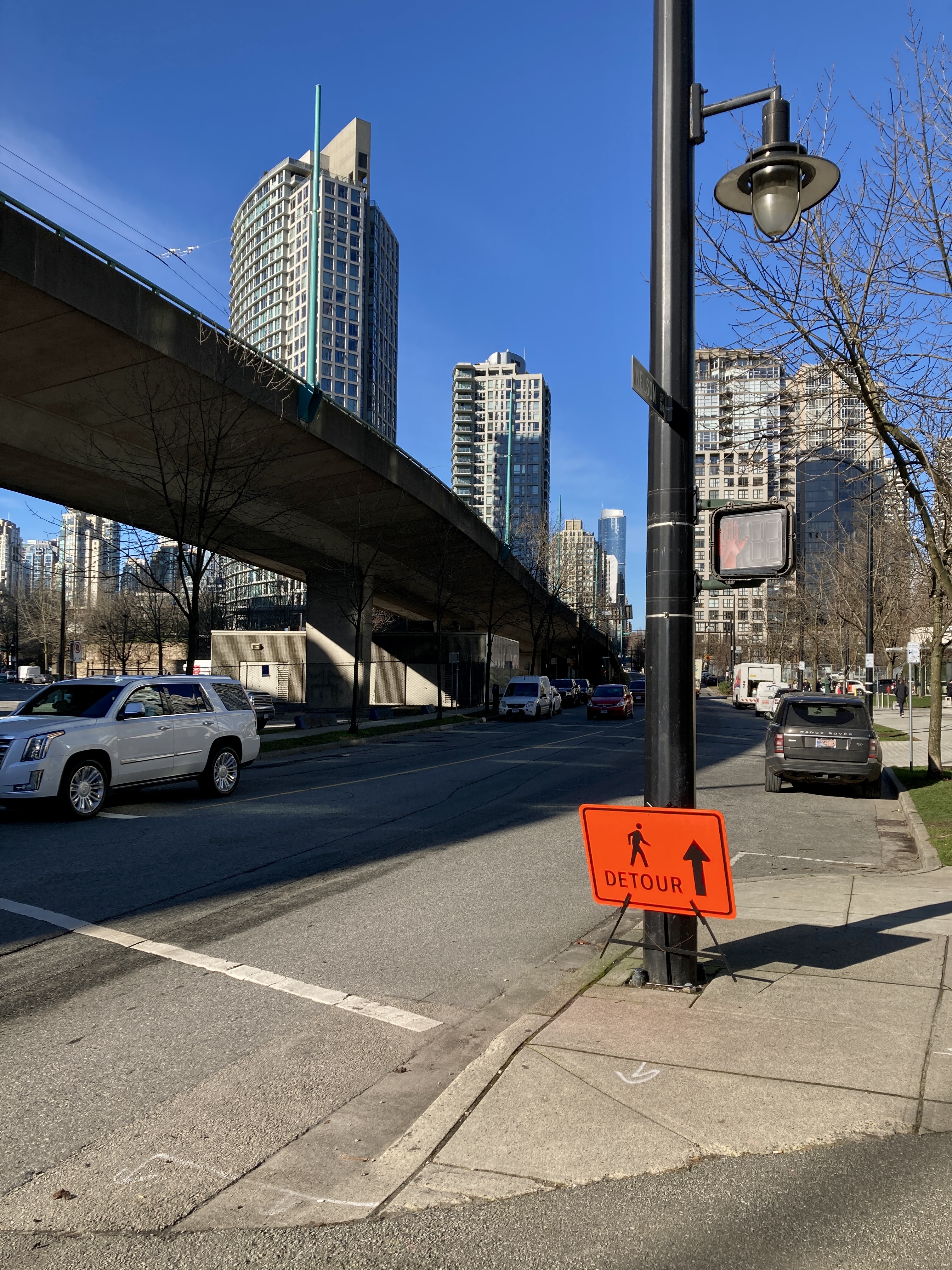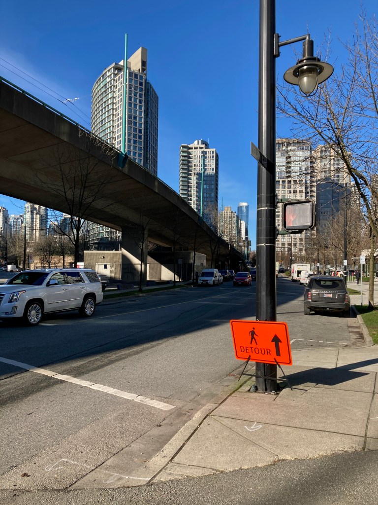 Street-side, signage tells me what the closures are all about. Text explains the need for structural repairs and seismic upgrades …