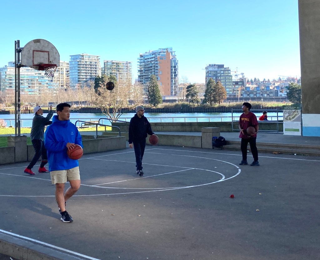 and four guys keep four basketballs busy on the court under the north-side access ramps to the Cambie Bridge.