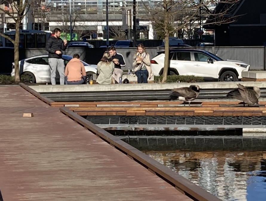 There are preening Canada geese and munching human youth by this condo water feature just east of the Creek …