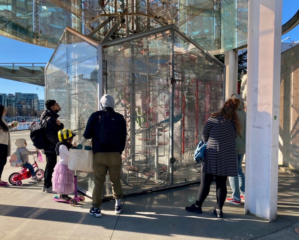 and humans of every age lolling, their bodies at ease with the temperature, as they watch balls carom off whirlygigs and springs go spronnnnggggg in this Rube Goldberg sculpture outside Science World. (I am particularly taken with the eclectic style of the little girl on the scooter: lavender princess-ballerina net skirt and a bumblebee helmet.)
