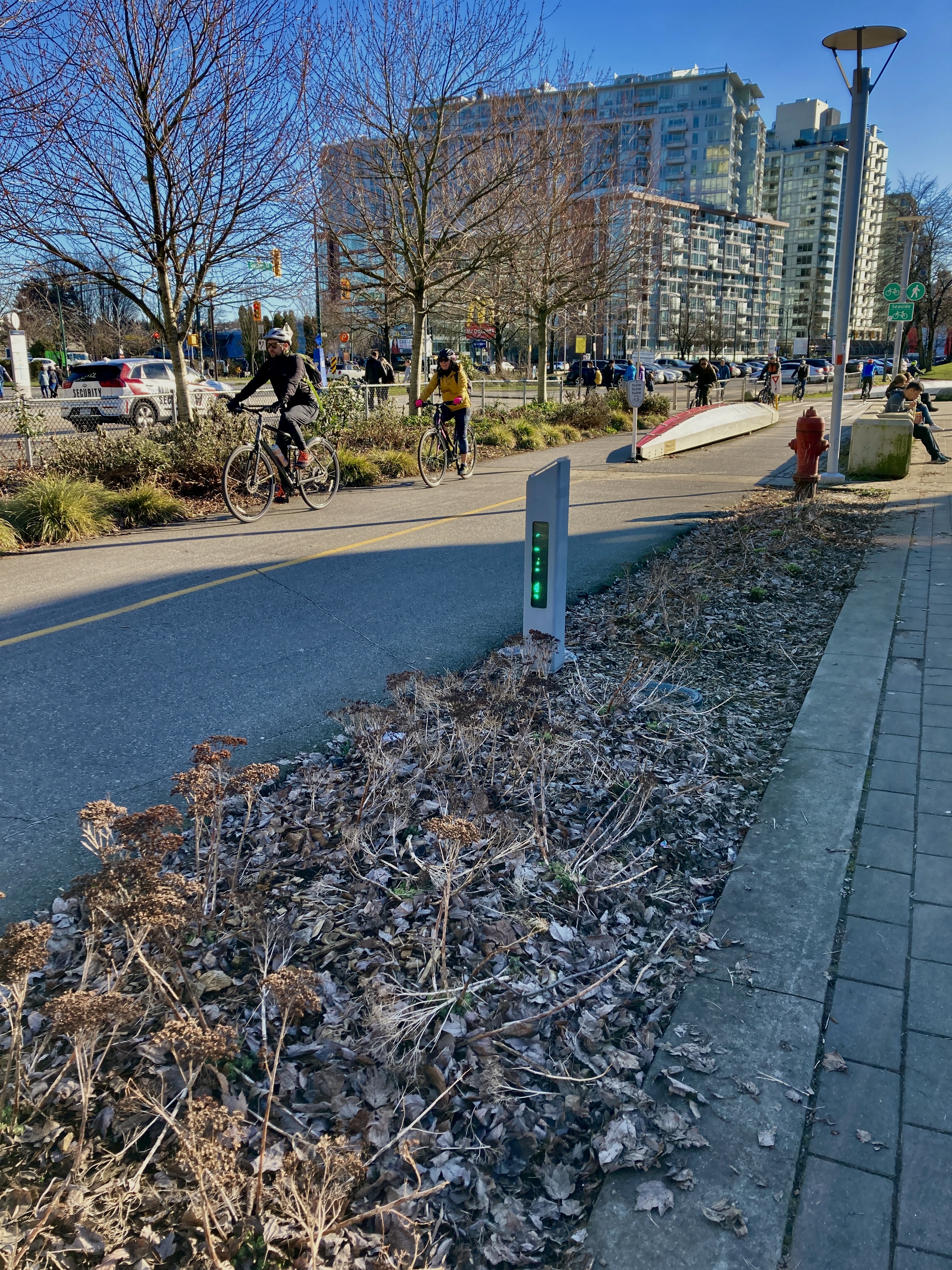 Two riders are about to pass the electronic eye on the cycle path as it dips behind Science World. When I arrived earlier, a read-out told me that 2790 cyclists used the path yesterday (midnight to midnight), and the current count for today was 800 and change. Now, a few hours later, it has already topped 1700.