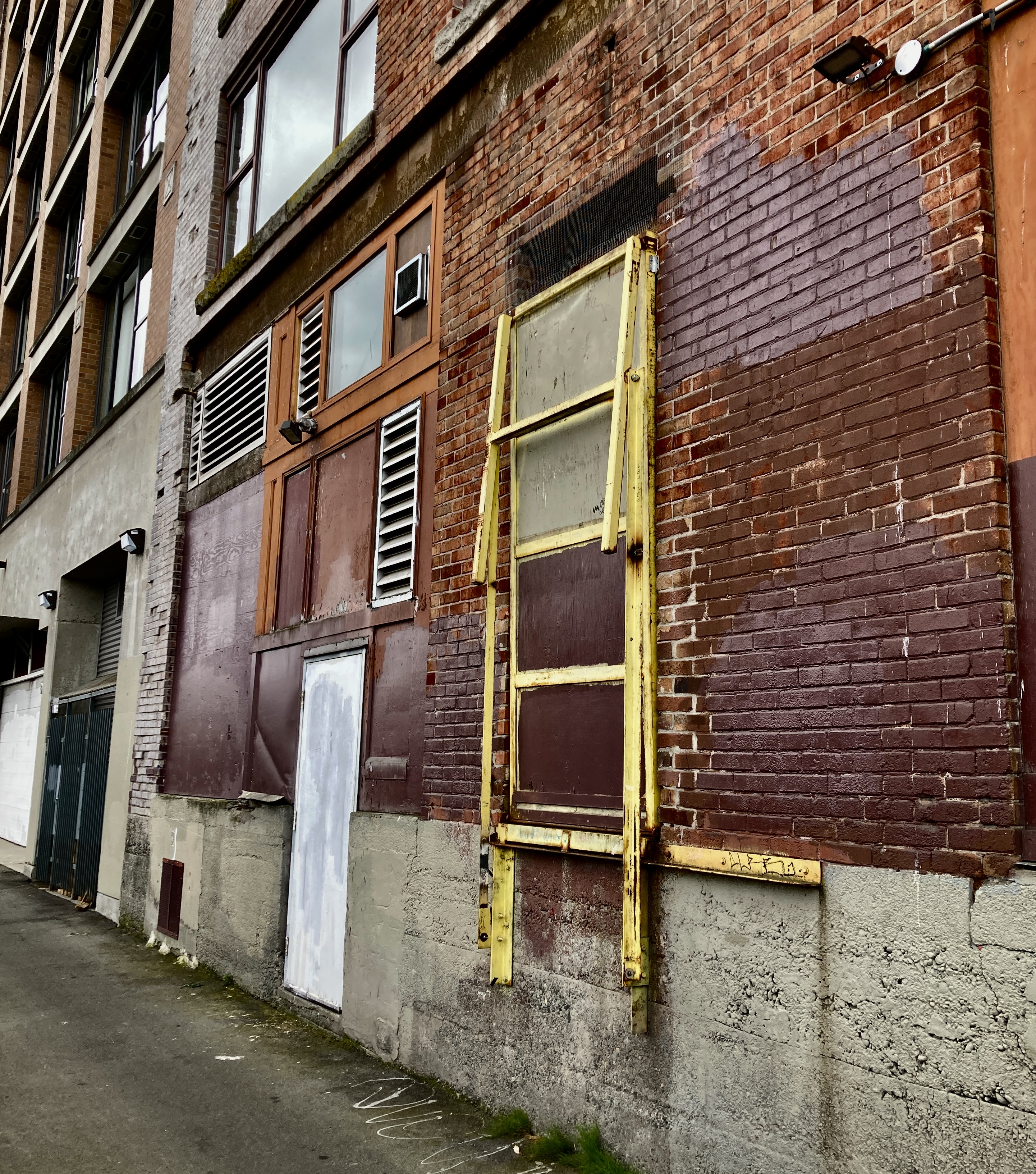 Instead, the grit of an alley. Showing not its Water St. Gastown-tourist face, but its back-door strictly functional face. And displaying, in the process, powerful graphics. Once again, geometry at work. I’m captivated by the lines and curves, but I don’t romanticize them.