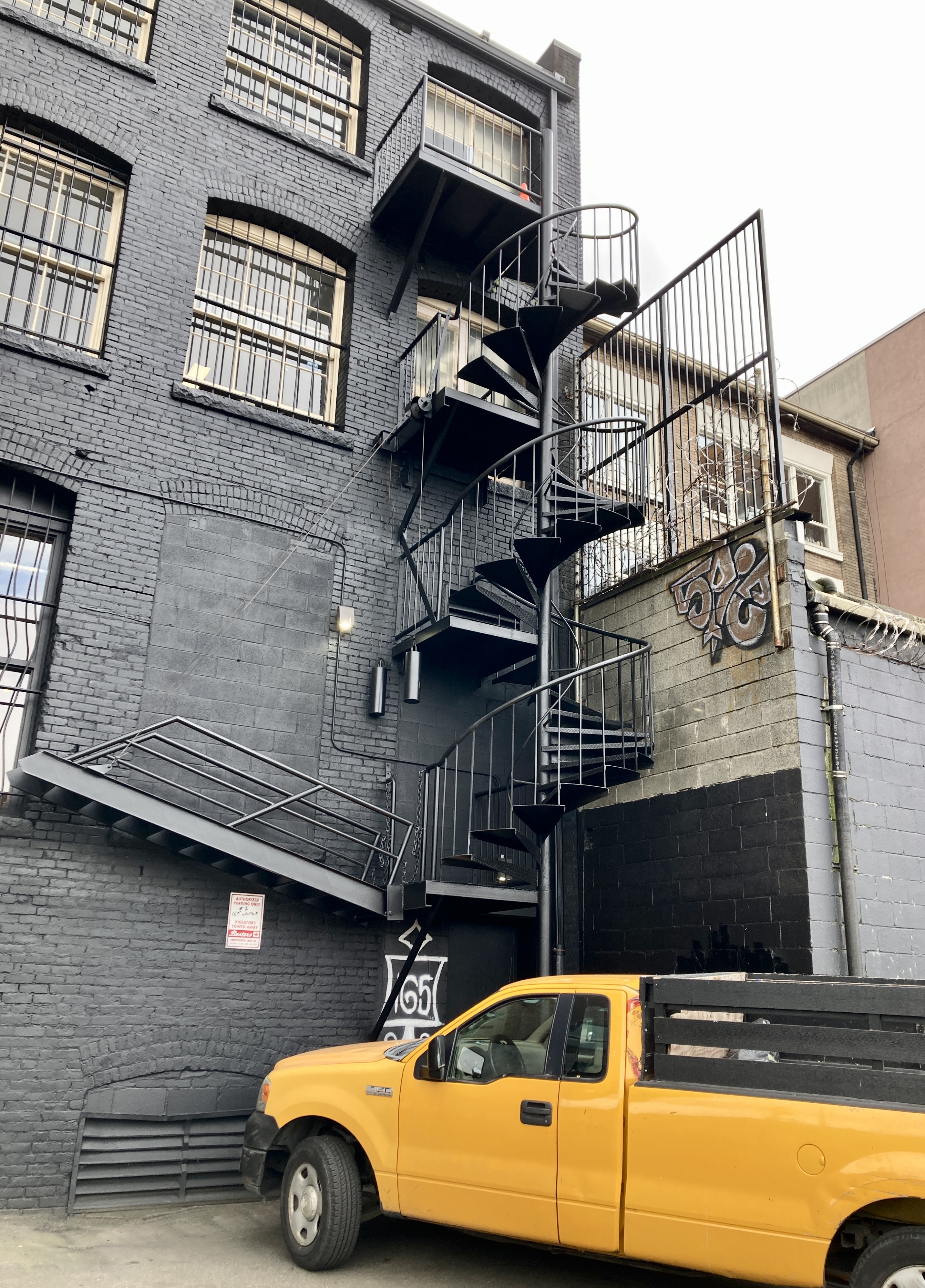This is a DTES (Downtown East Side) alley, and it is not romantic. While I tilt my head in appreciation of a spiral staircase (below), three bicycle paramedics roll by on one of their regular overdose patrols.