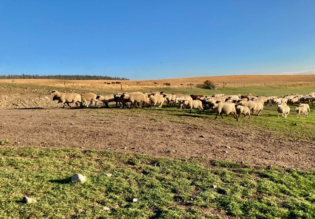 It’s a family ranch, producing grassfed beef and lamb, mostly for direct-delivery customers. I stand by, watching sheep streaming back toward the enclosures for their evening meal, with some cattle dotting the pastures just above, and feel catapulted into an Alberta Moment. (The terrain, the activity, the sky…)