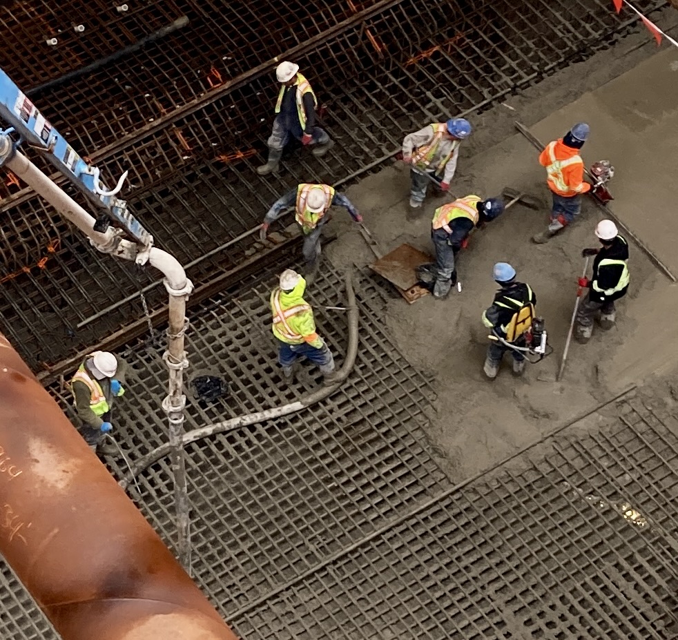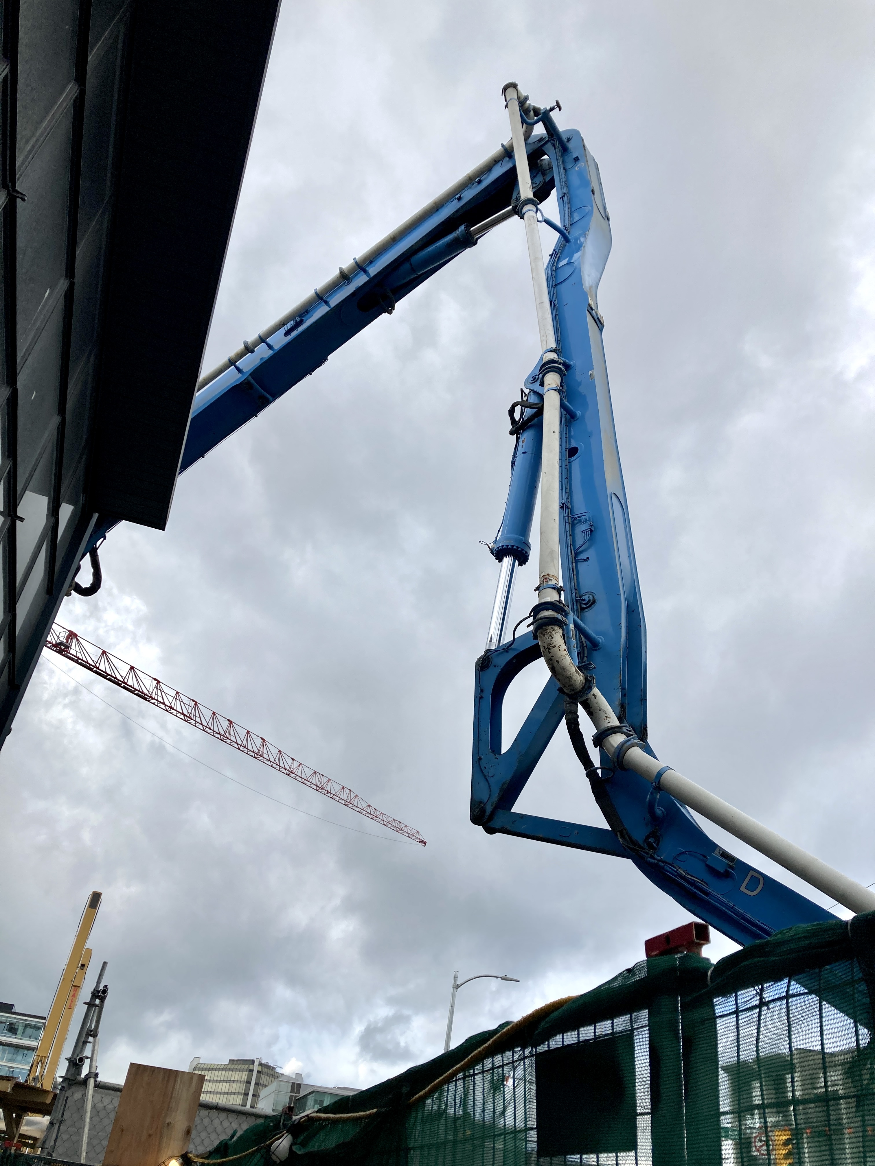 He generously waves me over, yielding his place at a much bigger gap in the mesh. He also explains what’s going on. Which is why I can now tell you, with considerable confidence, that the blue tube is pumping concrete…