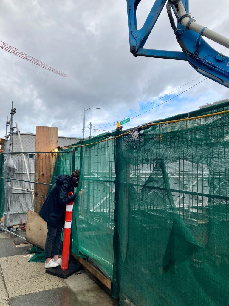 Some pedestrians are just stomping their way through the tunnelling disruptions to foot traffic, but many of us are downright fascinated. We stop, like this woman…