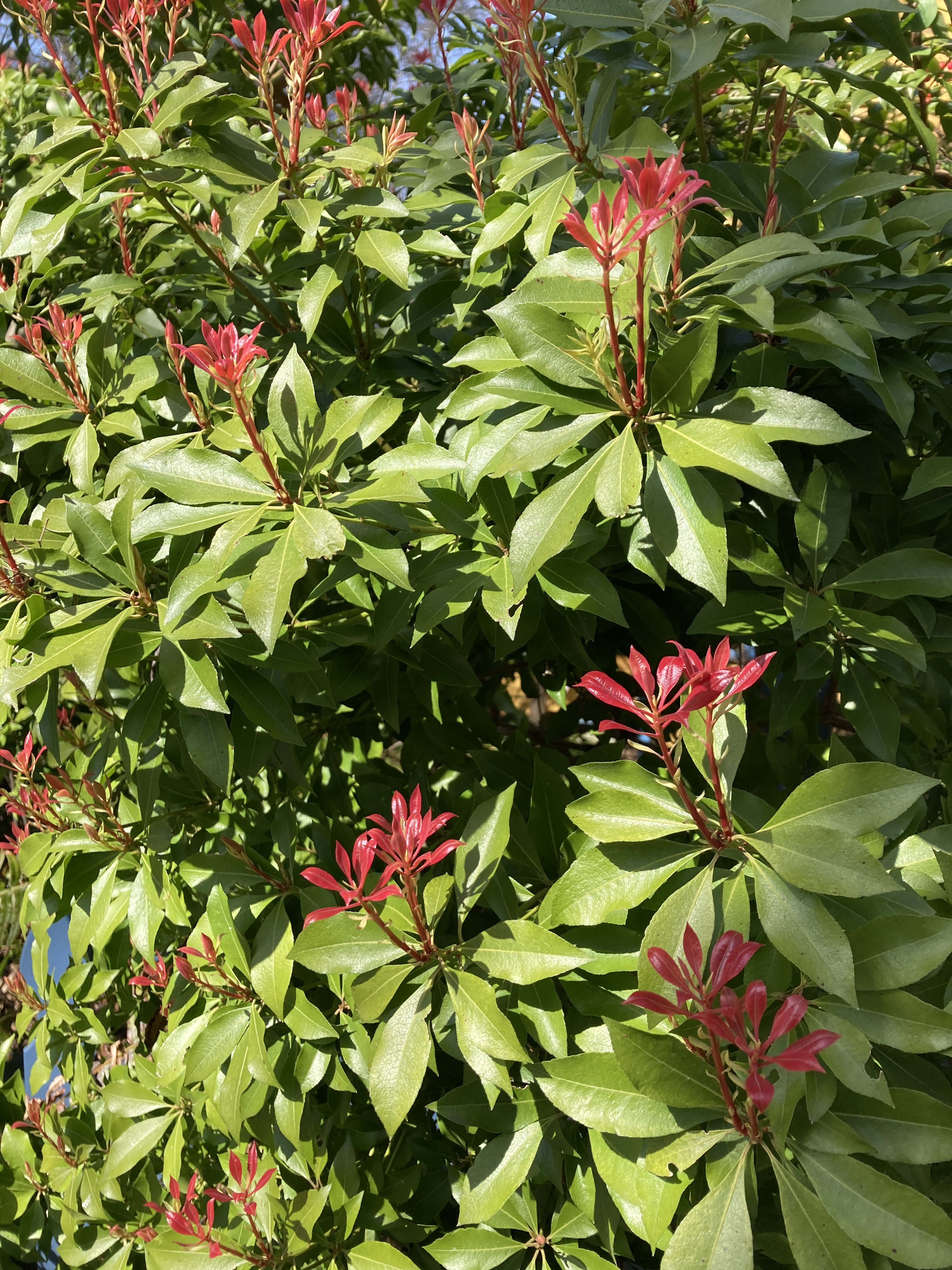 Farther down the block, a Mountain Fire Pieris flaunts its party trick…