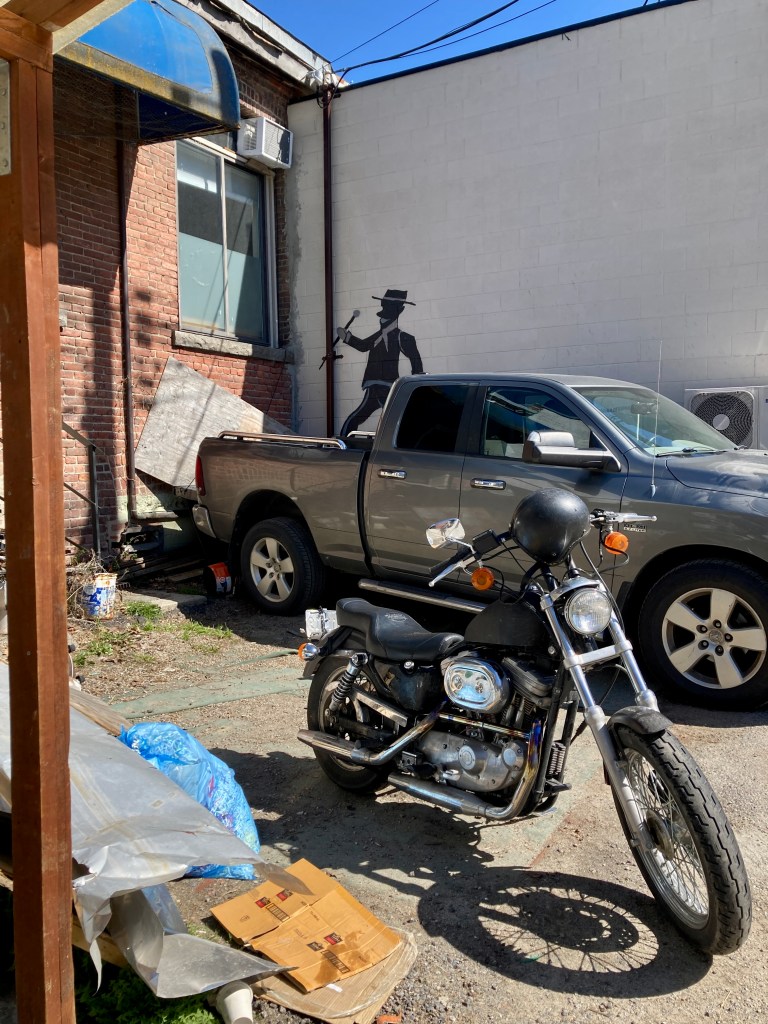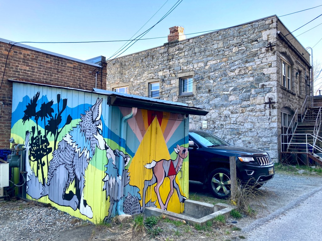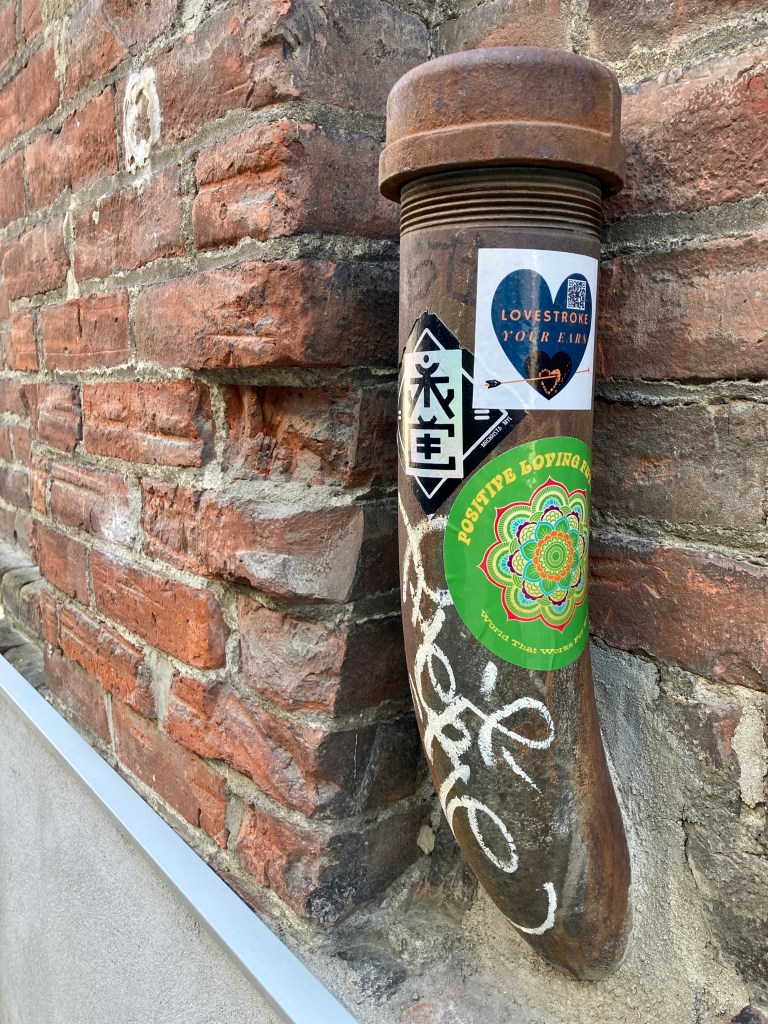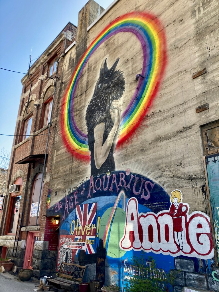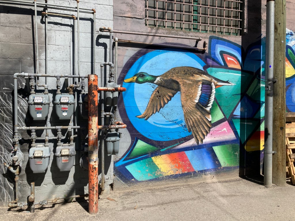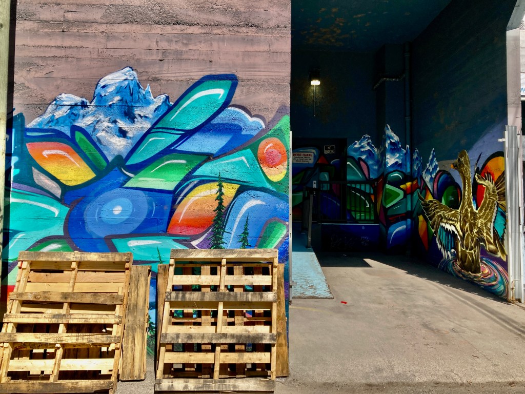 Young Man is eyeing us in a friendly but speculative way. We chin-point to the mural. “Love it!!” we say. He beams. “There are lots of murals in this lane, just keep going. And… thanks. This building, this mural, is mine.” We idly ask his business. “Cannabis,” he says. It’s a factual statement, no particular inflection.