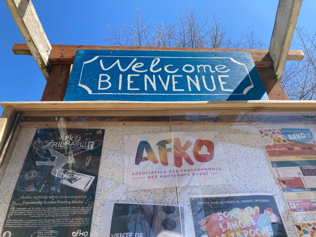 Across the street, the signboard for AFKO, Association des francophones des Kootenays Ouest…