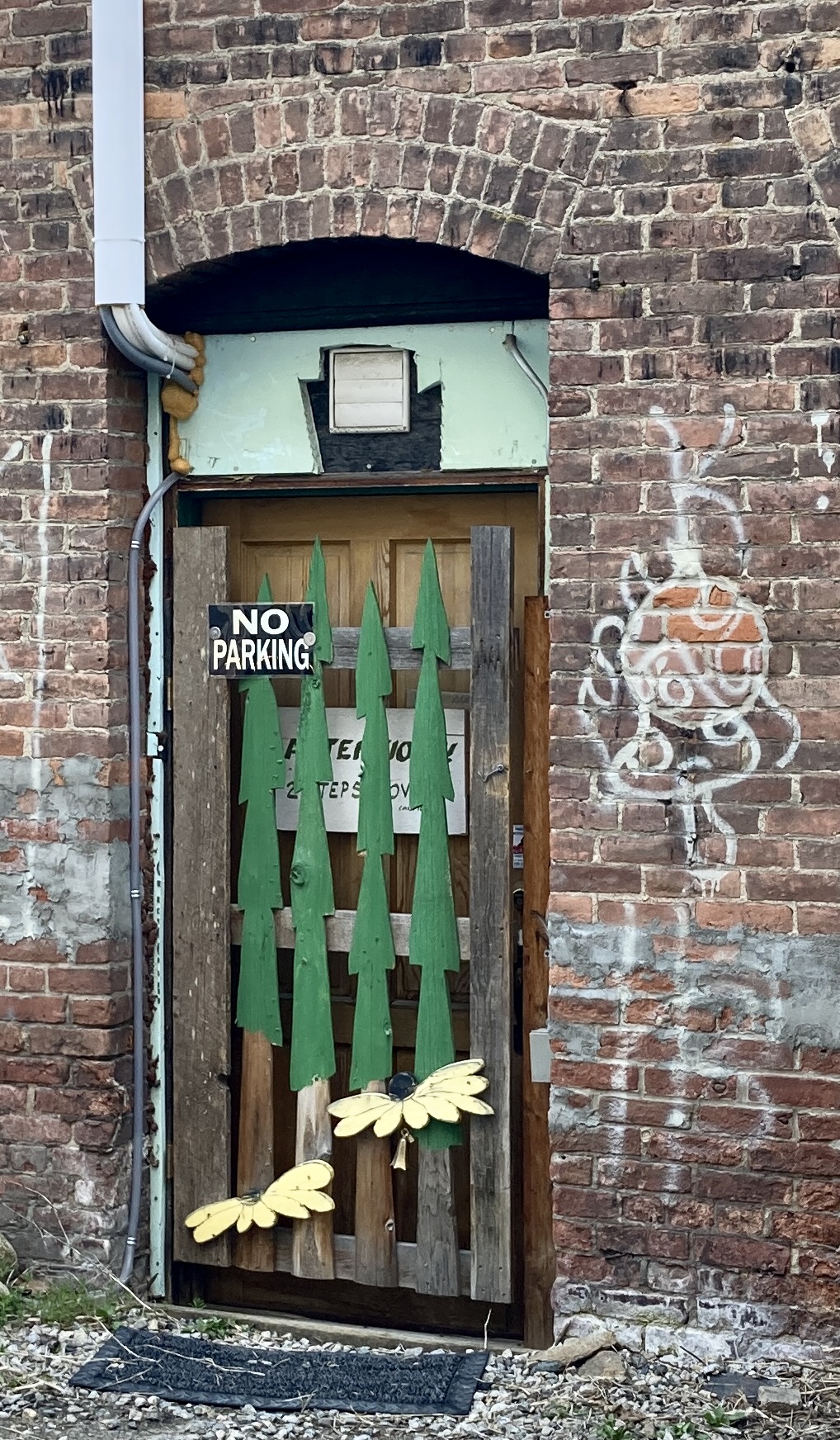 We tuck this away for later investigation. Meanwhile, we stick to what we can see, right here on the surface. This doorway, for example, next to Cannabis Man’s office building, with its evergreens and wildflowers…
