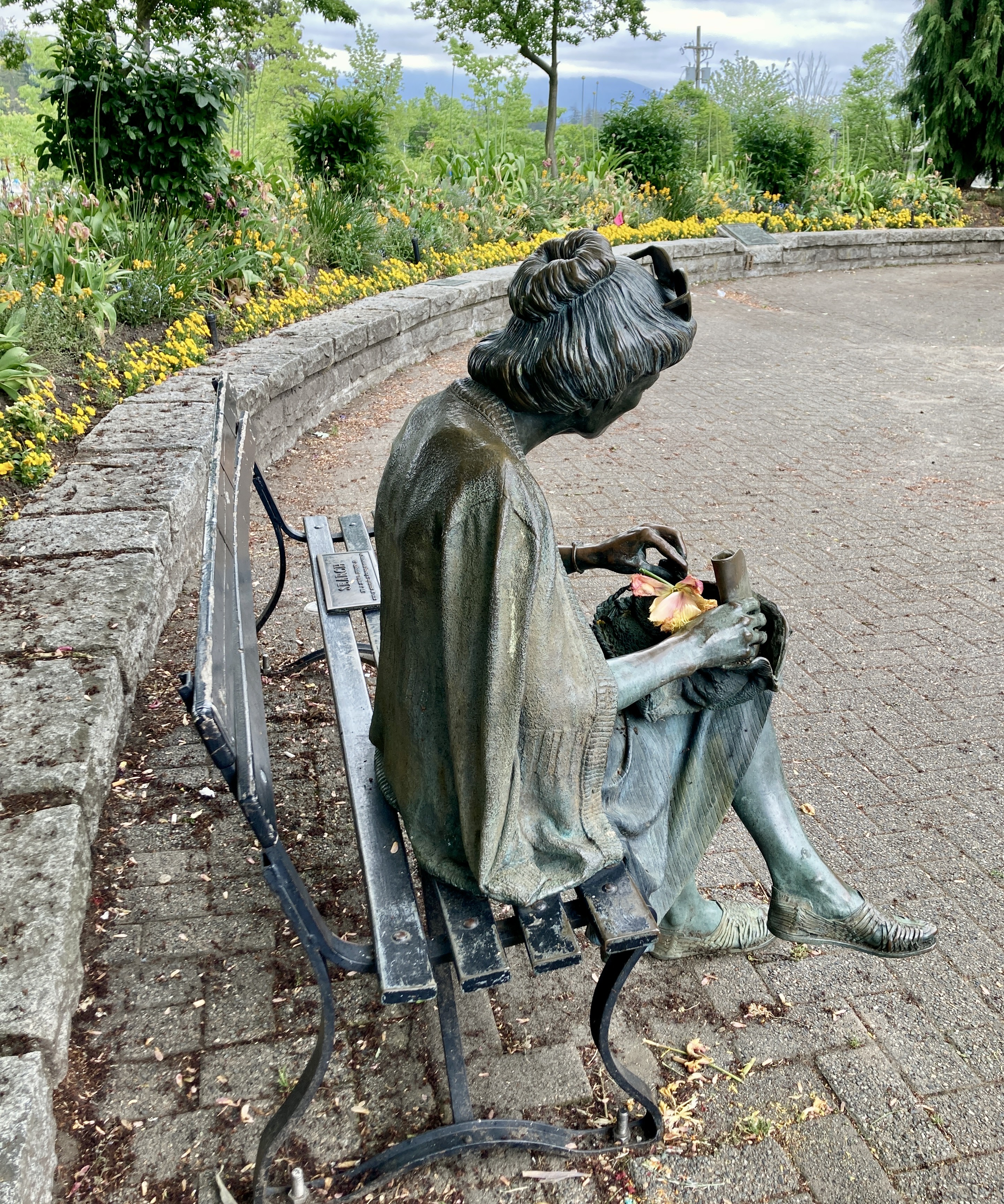 I’m just off the bus when I stop flat to admire this sculpture. No. Not the sculpture, though it deserves admiration. The title describes it: Search, by J. Seward Johnson Jr., is a full-size bronze figure of a woman looking for something in her purse.