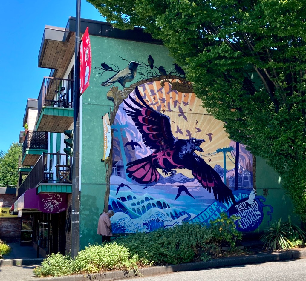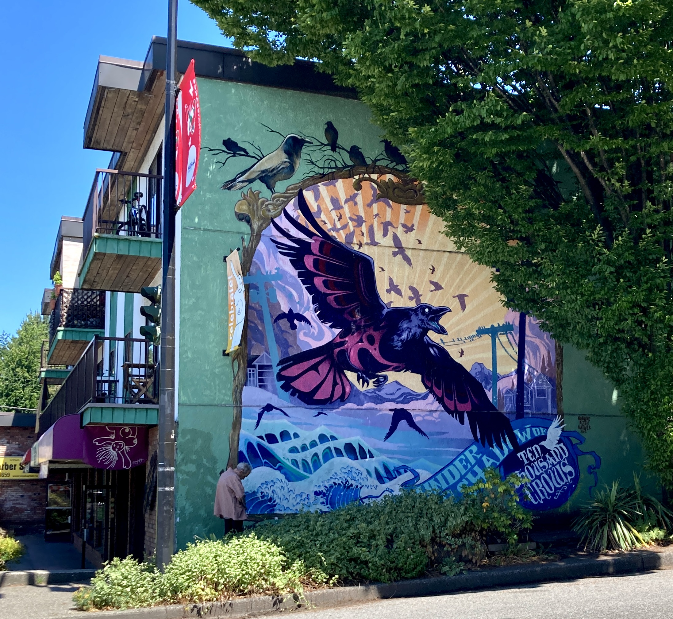 and, early in my Dog-Leg along bike route Adanac Street, a mere two crows fly away south in a mural bordering Woodland Park at McLean Drive.