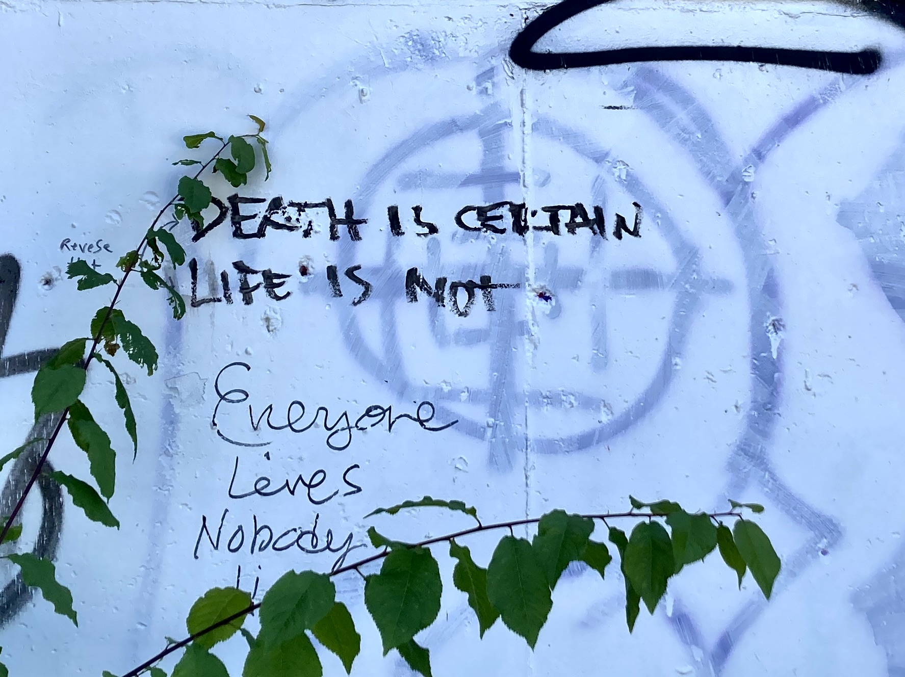 It offers me the certainties and uncertainties of life and death, debated in few but fervent words on an East Georgia wall just east of Clark…