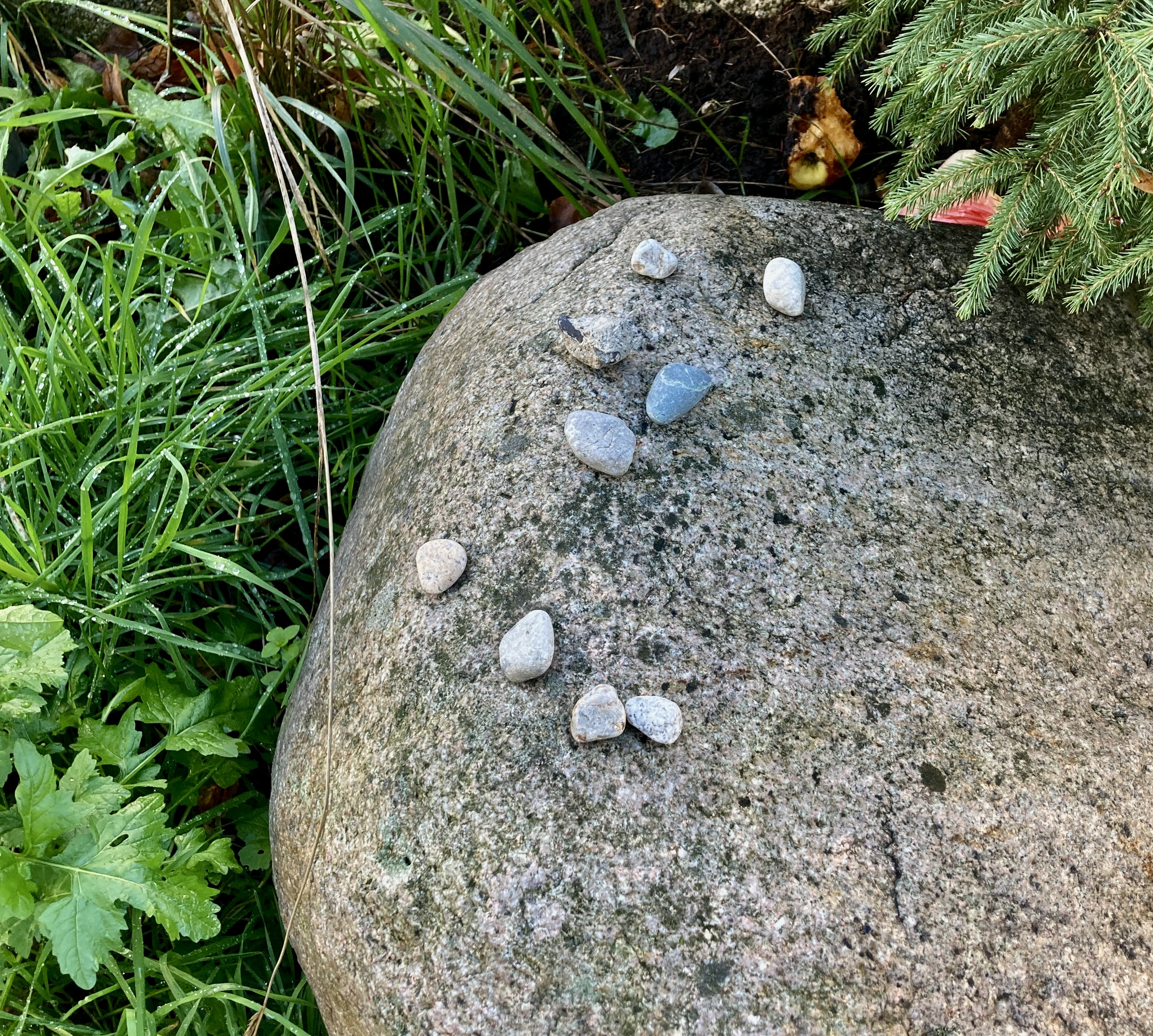 I walk north on Scotia, more or less tracing the now-sewered creek’s path toward False Creek itself. I pause at East 5th, to admire these pebbles so delicately placed on a street-corner rock…