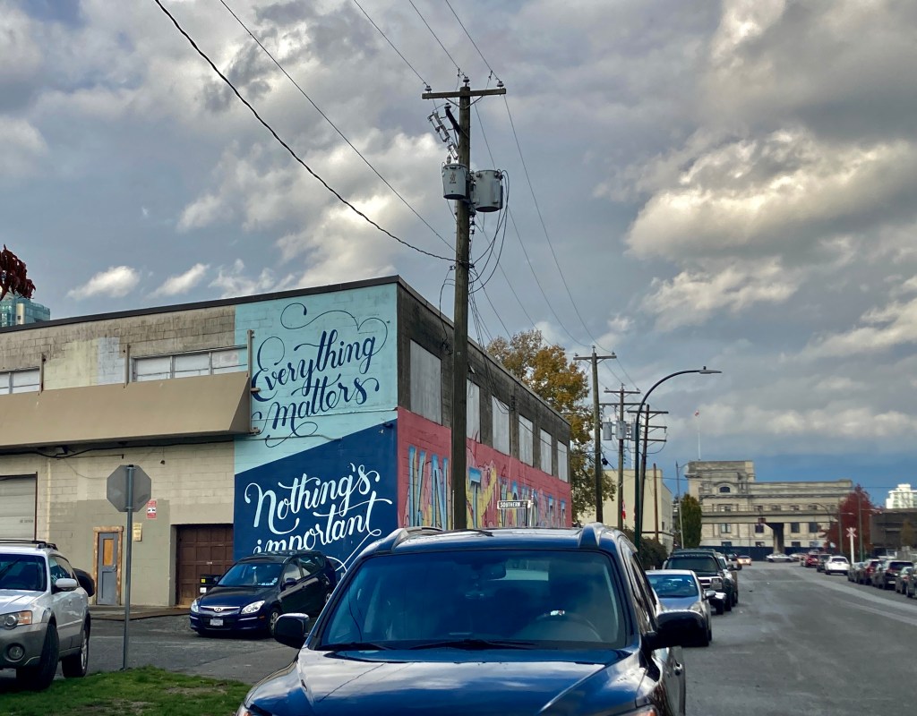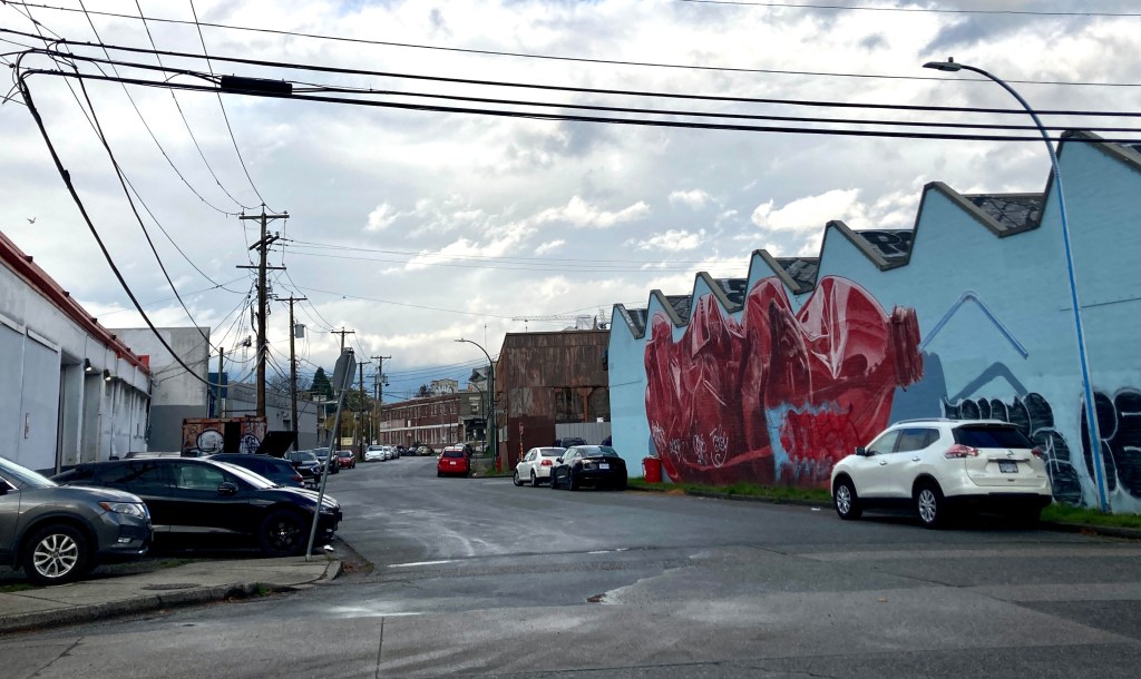 My brain expects my body will walk straight on (yet again, I grant you) to False Creek. My feet decide otherwise. Two snappy right turns — and here I am at Industrial Avenue & Western Street, on the edge of False Creek Flats.