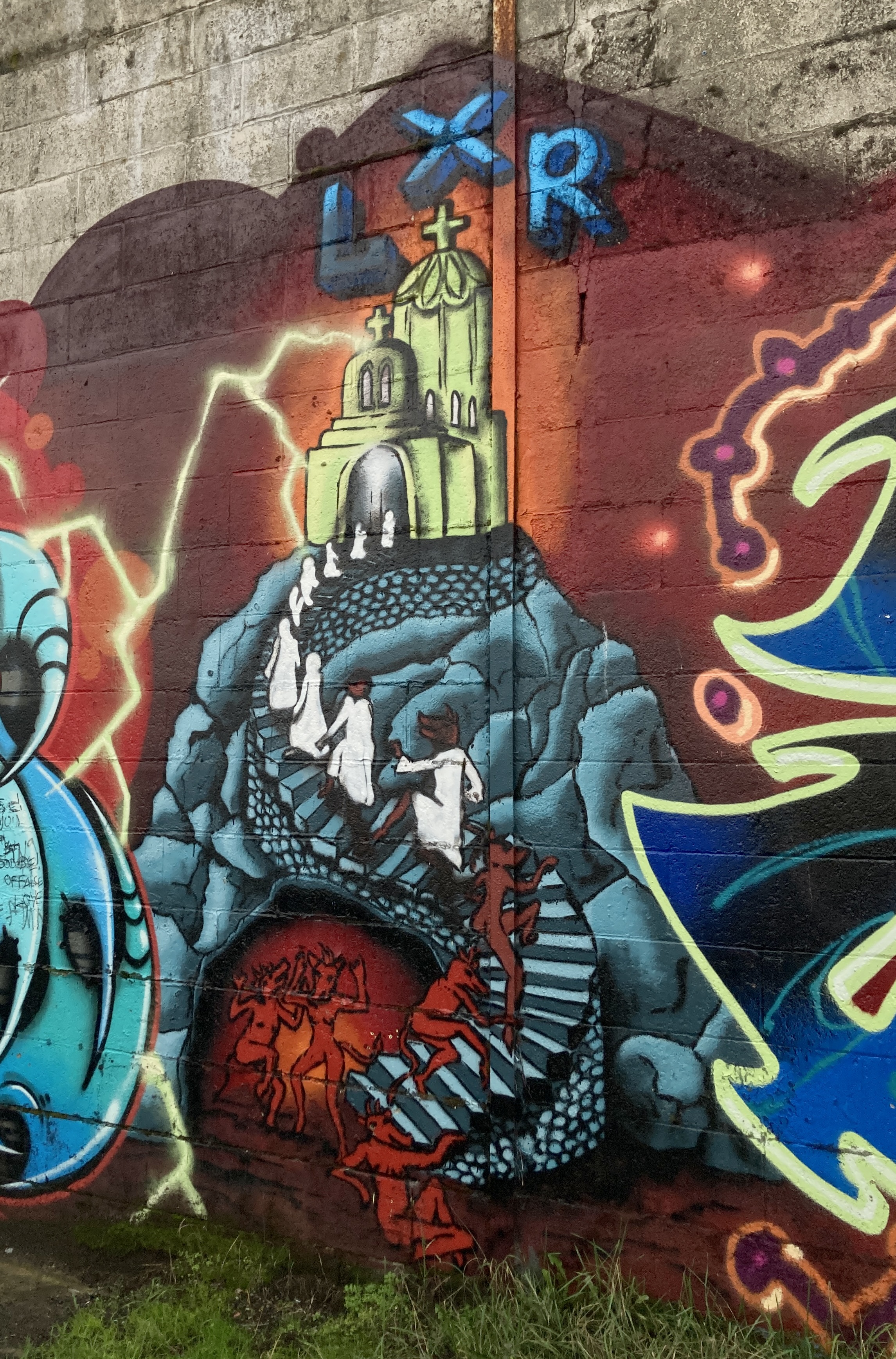 I think of it as home territory for the first-ever, the 2016, Vancouver Mural Festival. Some of the murals are still in surprisingly good shape — and still relevant. The largely red one you see above, on that blue wall, by Nevercrew…
