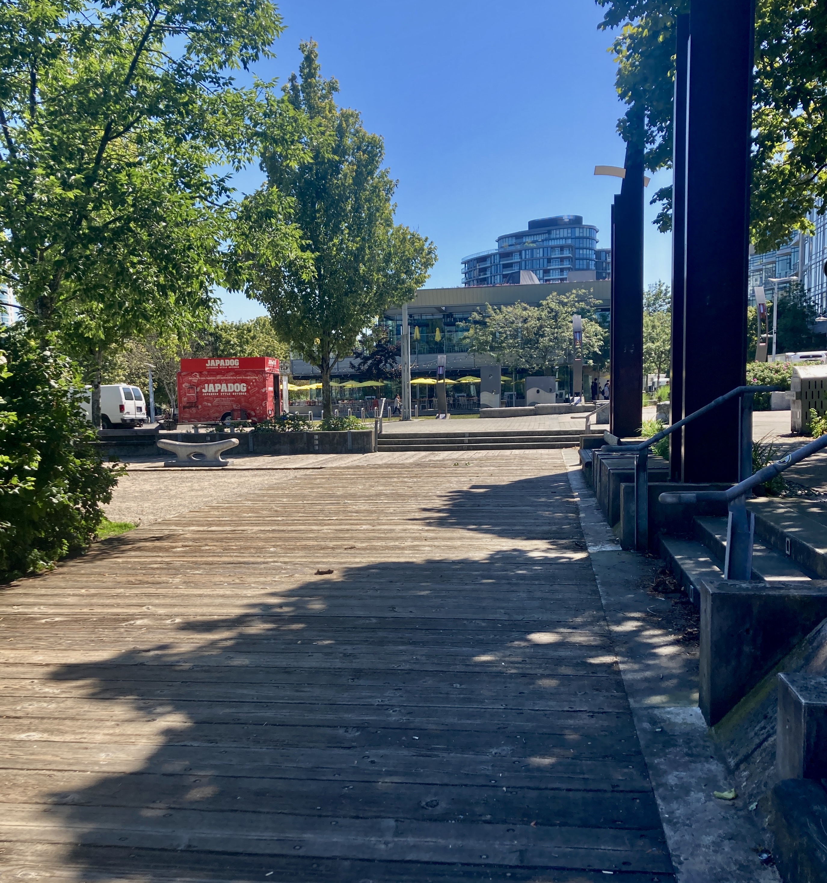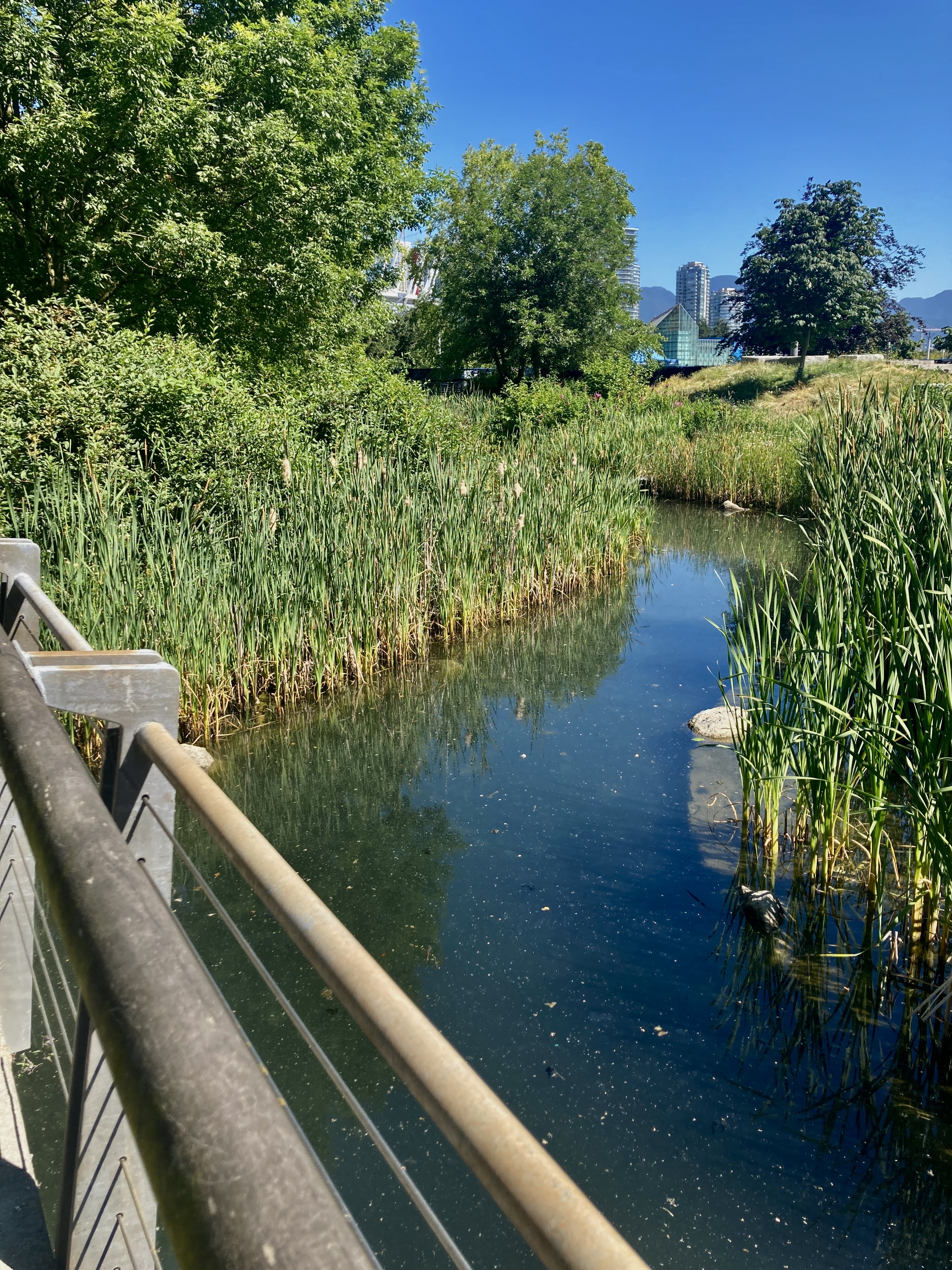 My eyes, and my feet and everything in between, we all step off West 1st Avenue near Columbia Street to head north into Hinge Park. It is a wetland park adjacent to False Creek, named for the sharp kink, the “hinge,” in the traffic grid right about here.