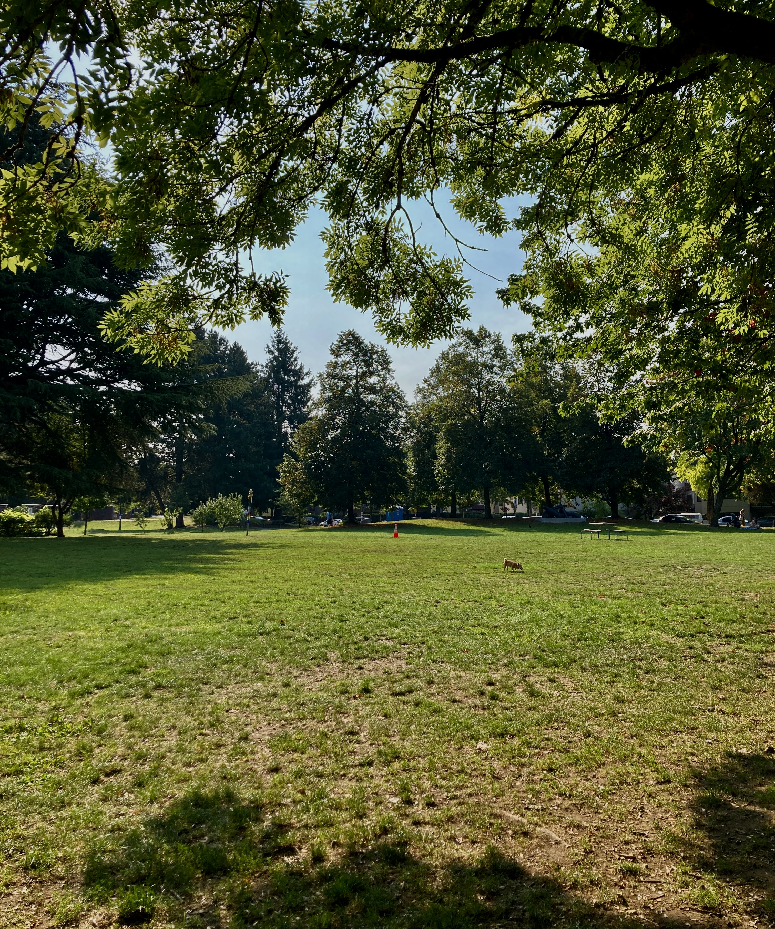 {Later, I will cross paths with a neighbour, who tells me his very small, and very old & frail, dog likes this park: “The dogs are always friendly.”)