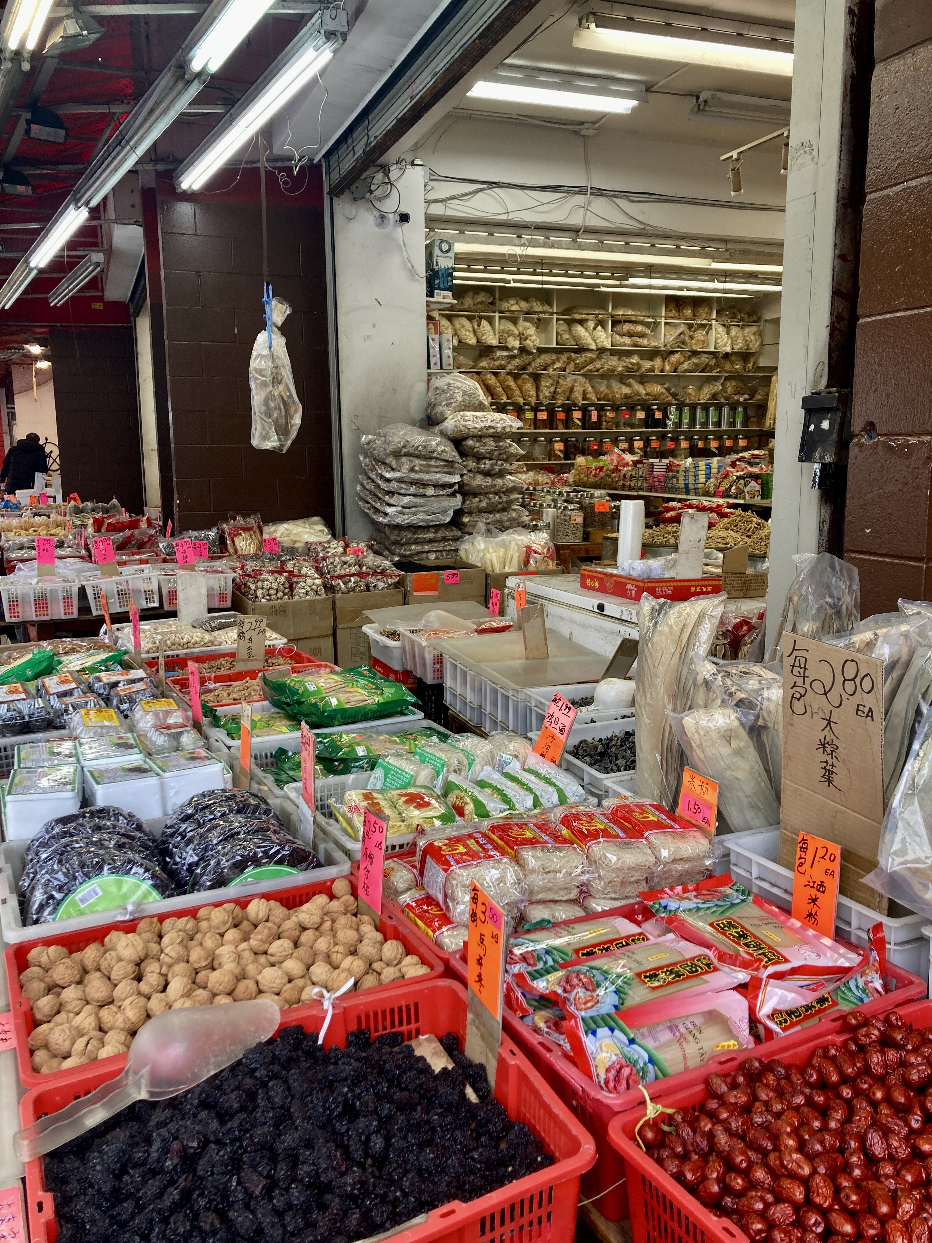 past the gloriously pungent Chinese market spilling out over the sidewalk…