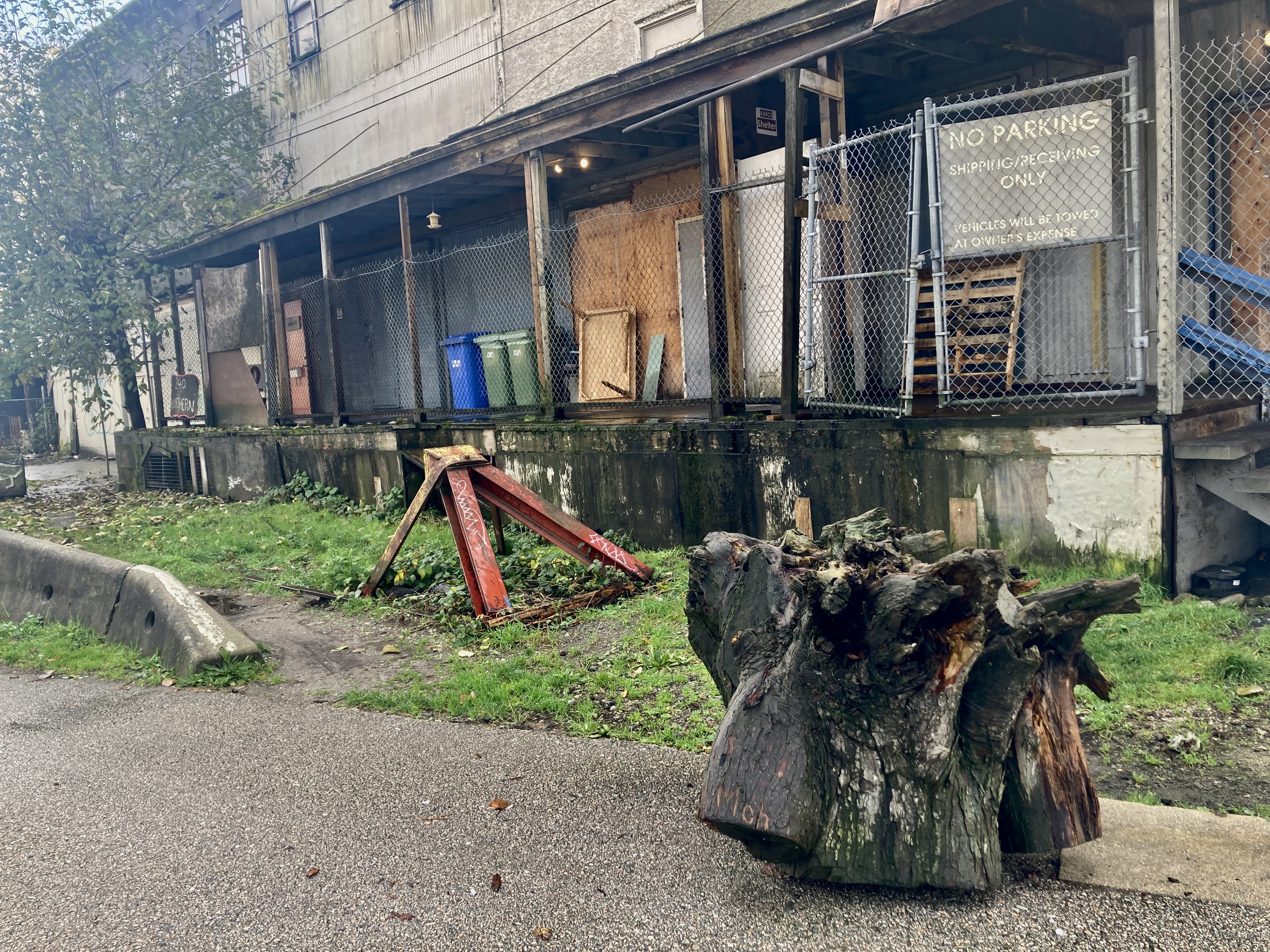 A huge stump marks the corner of Western and Northern. The building looks more derelict every year, yet it is still in operation, as its grumpy shipping-receiving notice makes clear.