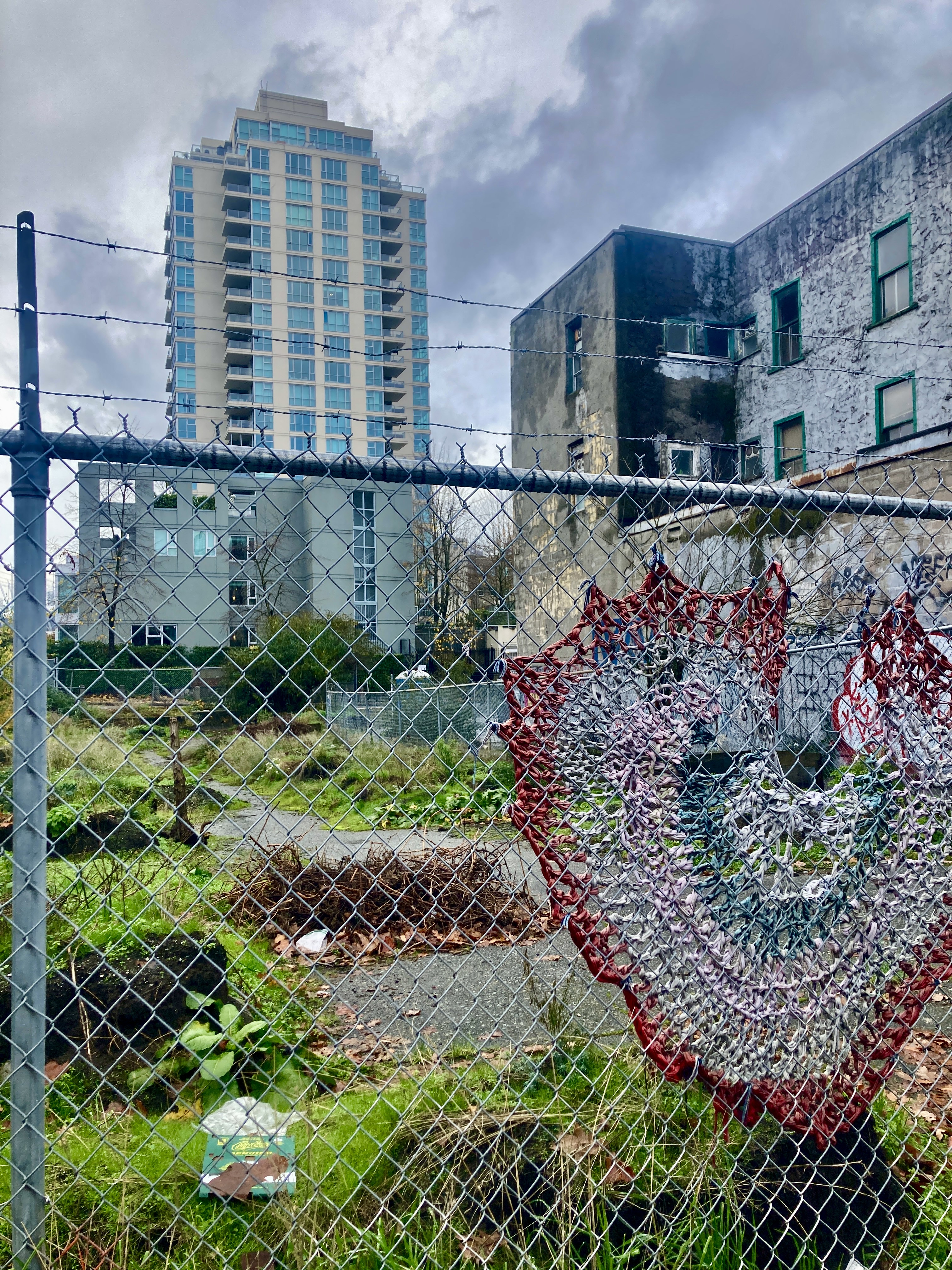 Yes, it’s behind chain-link fence and yes, it is November-dreary. But it is also a seasonal community garden, here at the corner of Milross, and it bears our local Yarn Bomber’s tribute of a crochet heart — recognition of the resilience of people doing what they can, in a tough context.