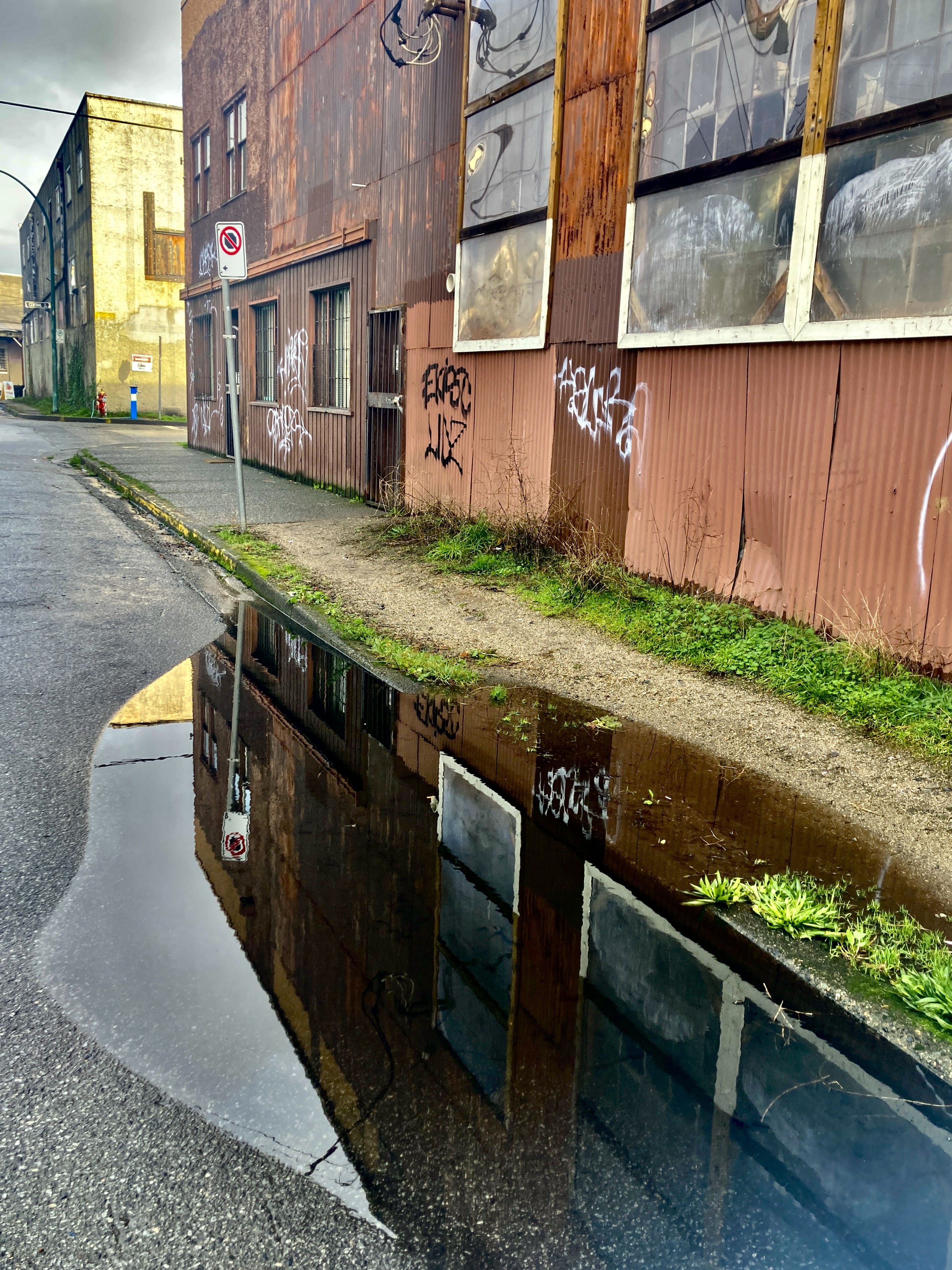 but I’m even more taken by this tear-drop puddle reflecting the warehouse back at me, as I round the corner to head north on Western.