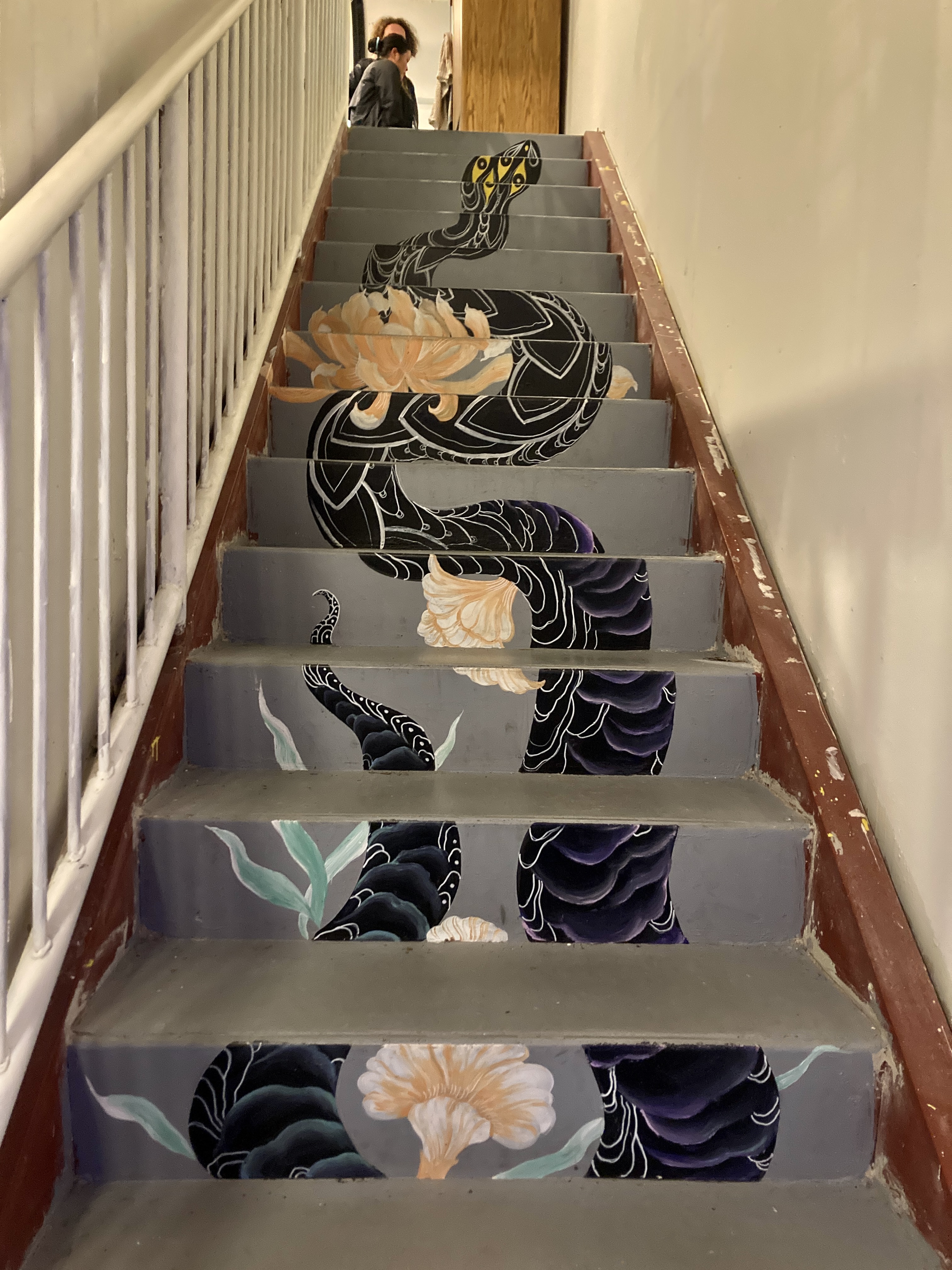 A word about stairs. Stairs literally come with art-crawl territory, since studios are usually located in the higher reaches of their respective buildings. Savvy artists, like these Pot Spot folk, make sure you know which stairs to climb…