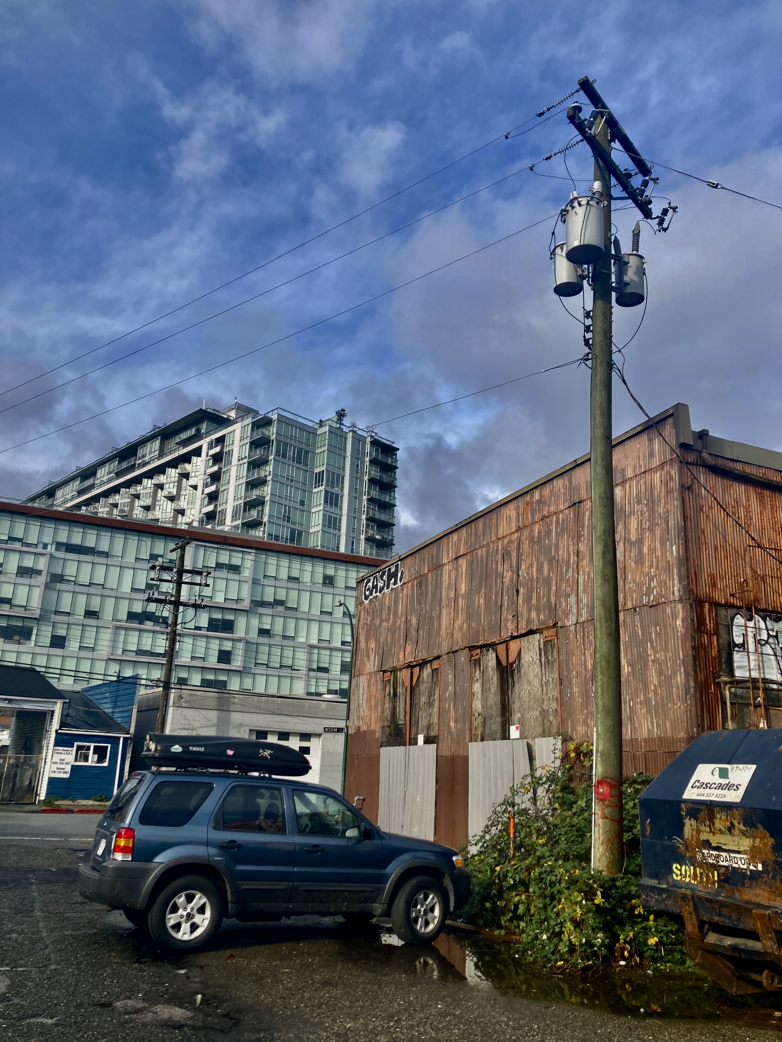 I pass one of my all-time favourite rusty warehouses at the corner of Southern and Western, now with a gleaming new high-ish rise in the background…