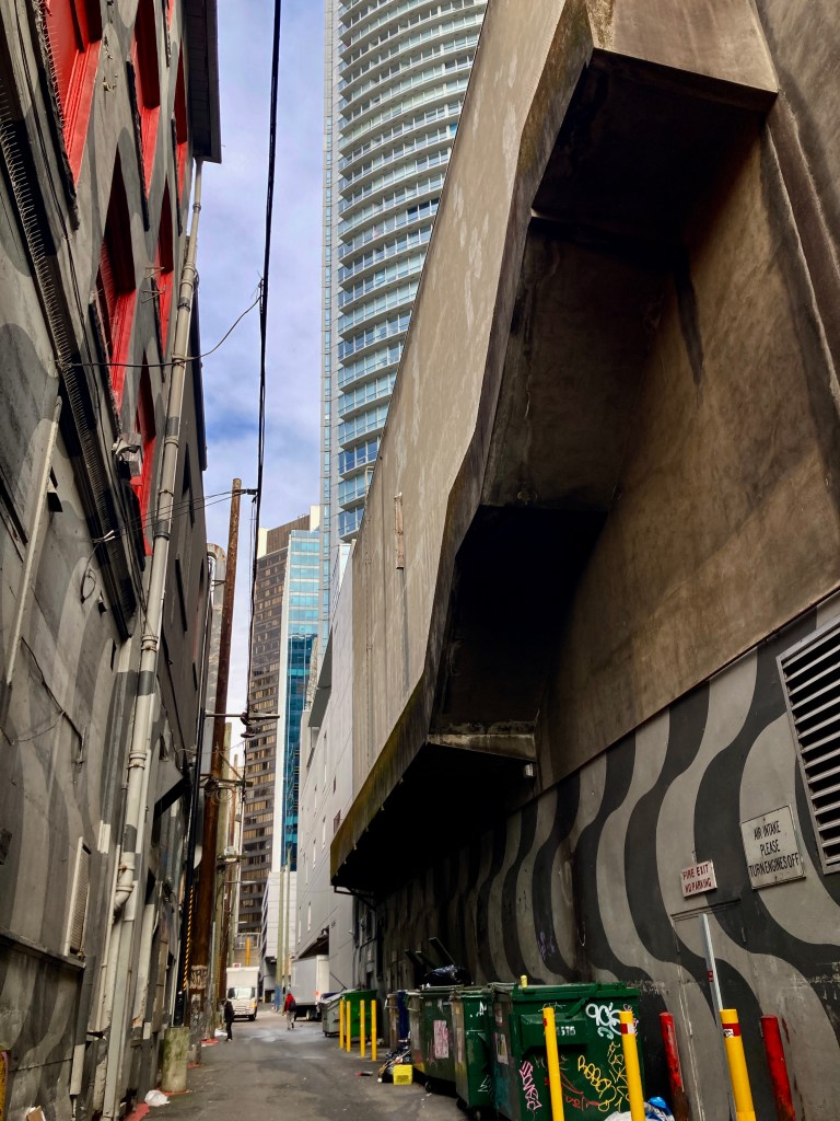 The alley backs the Orpheum Theatre on Seymour, and celebrates the venue’s long (and continuing) history of live performances. It was painted and generally spiffed up in 2018, the idea being to welcome pedestrian as well as the existing delivery-truck traffic. I had recently arrived in town, walked it then, and yes, it sparkled.