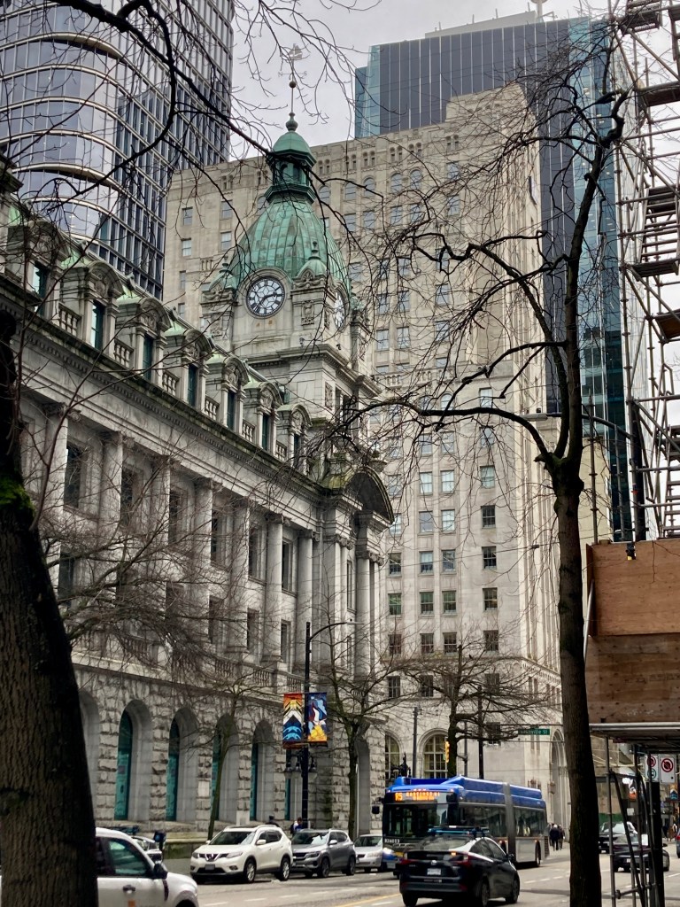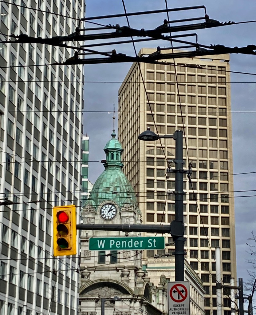 By now I’m well off-track for the mystery dome. I correct course and walk west on Hastings. This time the urban clutter offers me a distant view of the Marine Building at Burrard, framed against glass towers, and a close-up of elaborate lanterns and trim on another heritage building right next to me.