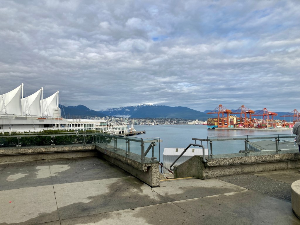 harbour cranes, Waterfront Station, the SeaBus terminal, train tracks and a helicopter landing pad.