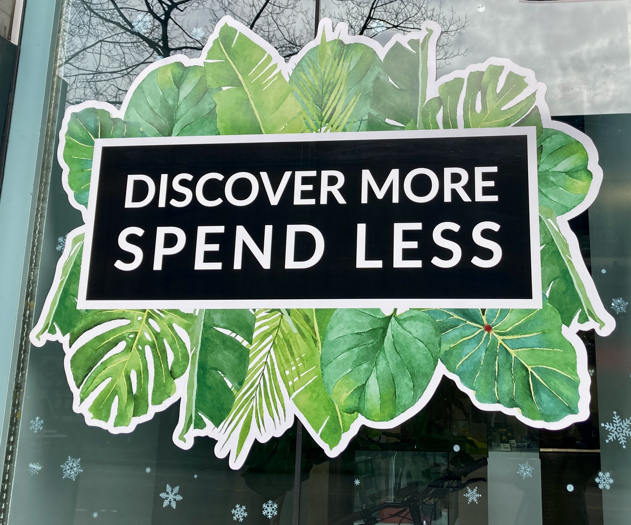 Well… not exactly. This is the window of a cannabis shop, which prides itself on bargain prices. So: keep spending money, just spend it with us! (And discover the wonders of our products.)