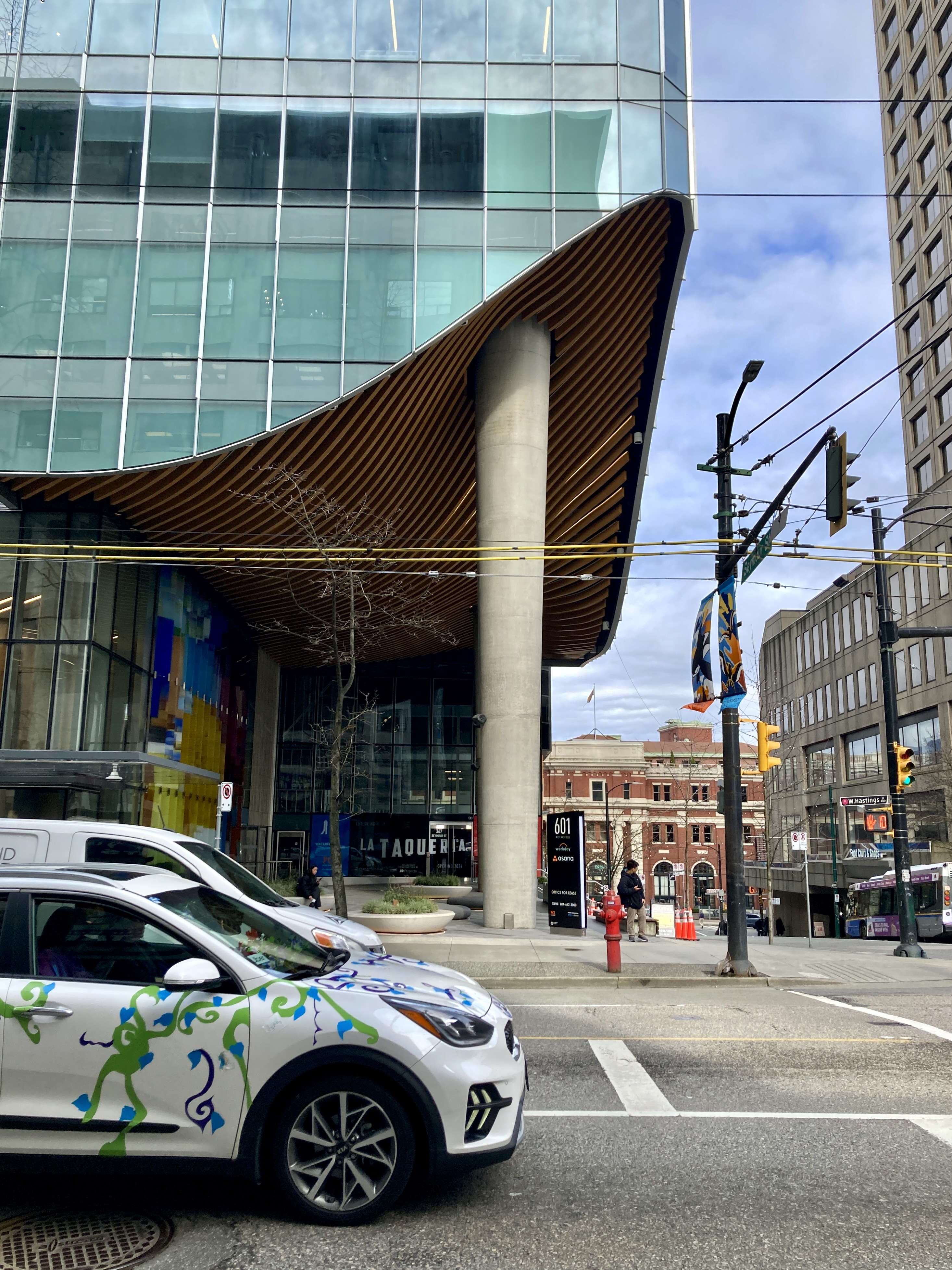 This brings me to Seymour and West Hastings, with Waterfront Station in the distance and this building opposite, whose upturned lip always makes me think of whale baleen. (That frog-splattered white car, even closer, is a gift from the Traffic Light Gods.)