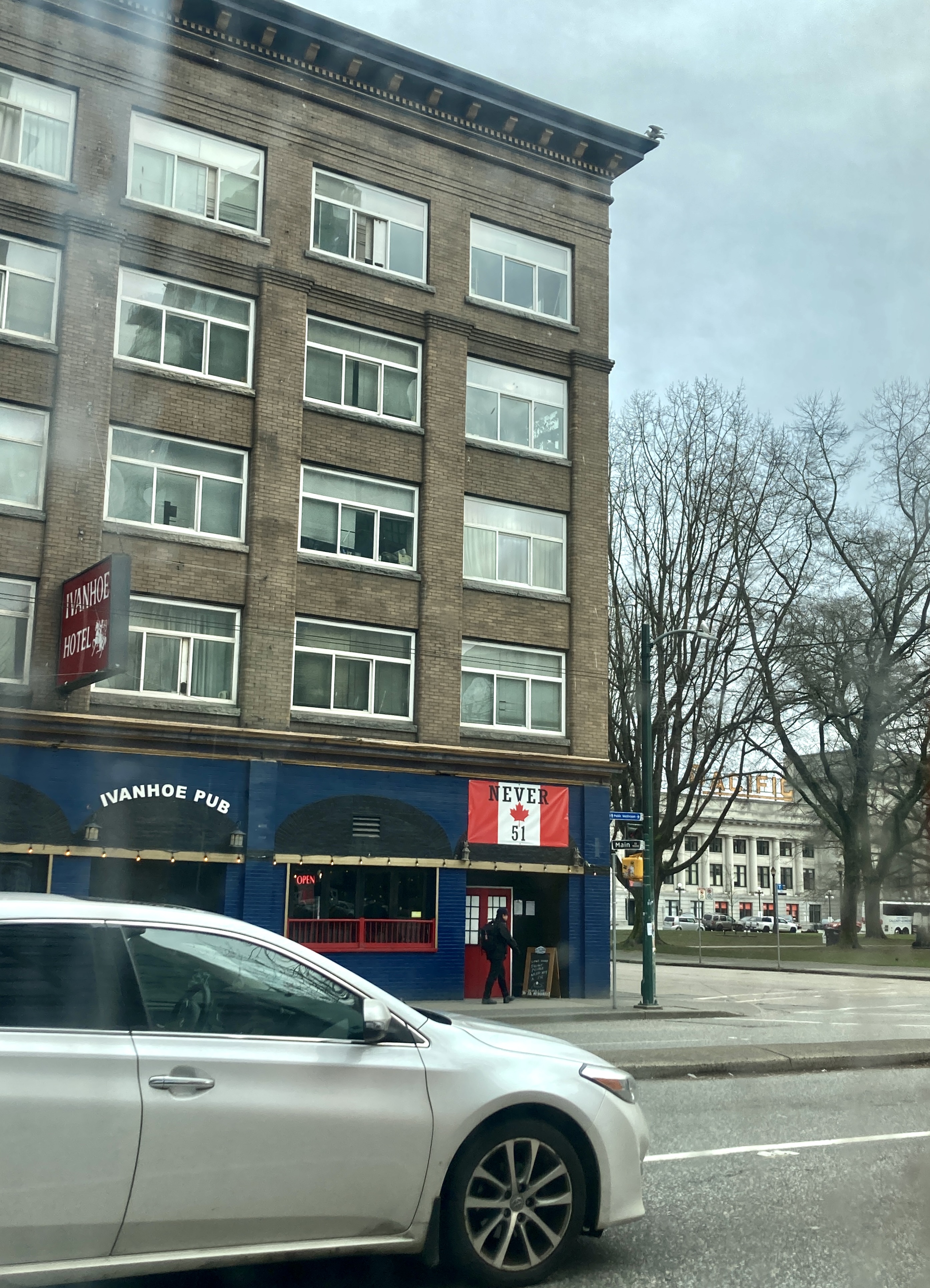 The Pacific Central train station is in the background, but who cares. I’m focused on the red & white “flag” now installed above the pub entrance, right at the cross-street. It is yet another literal sign of our politico/cultural times.