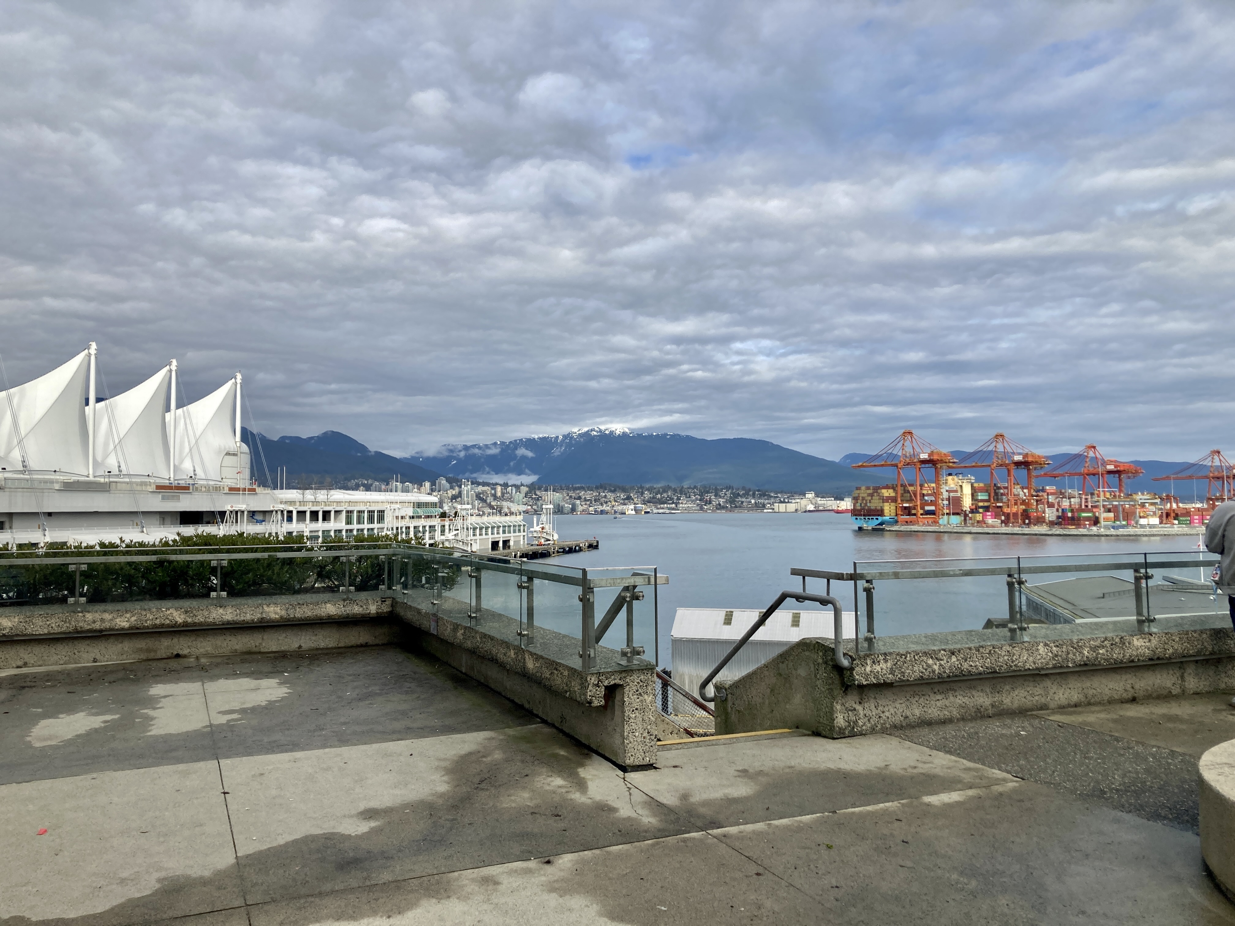 Perversely enough, I now head away from the mystery dome. Instead, I follow the raised Granville sidewalk all the way north to the lookout at Burrard Inlet.