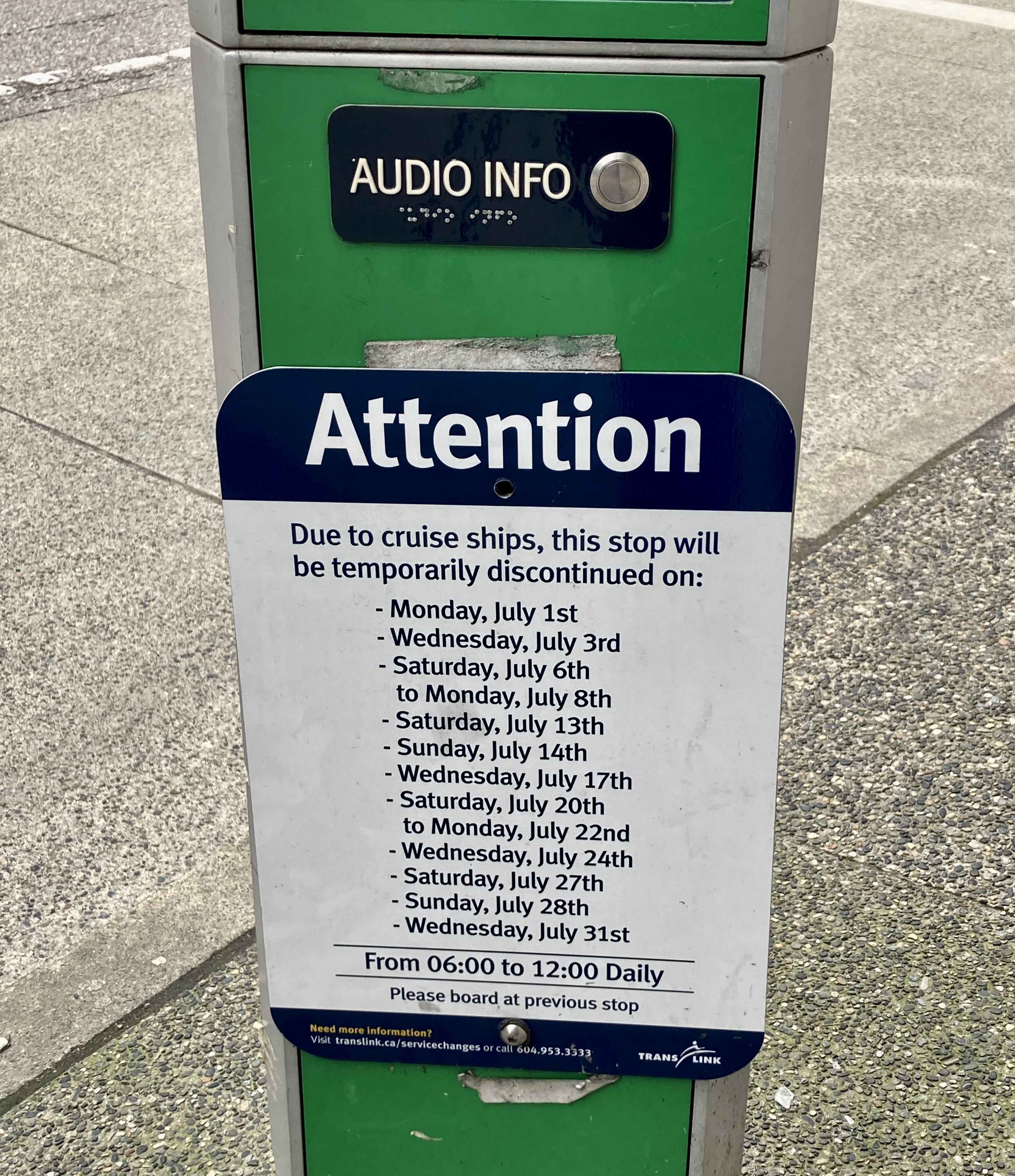 The bus stop at Granville is a reminder that the cruise ship terminal is nearby and, in season, its passenger loads wreak havoc with local traffic.