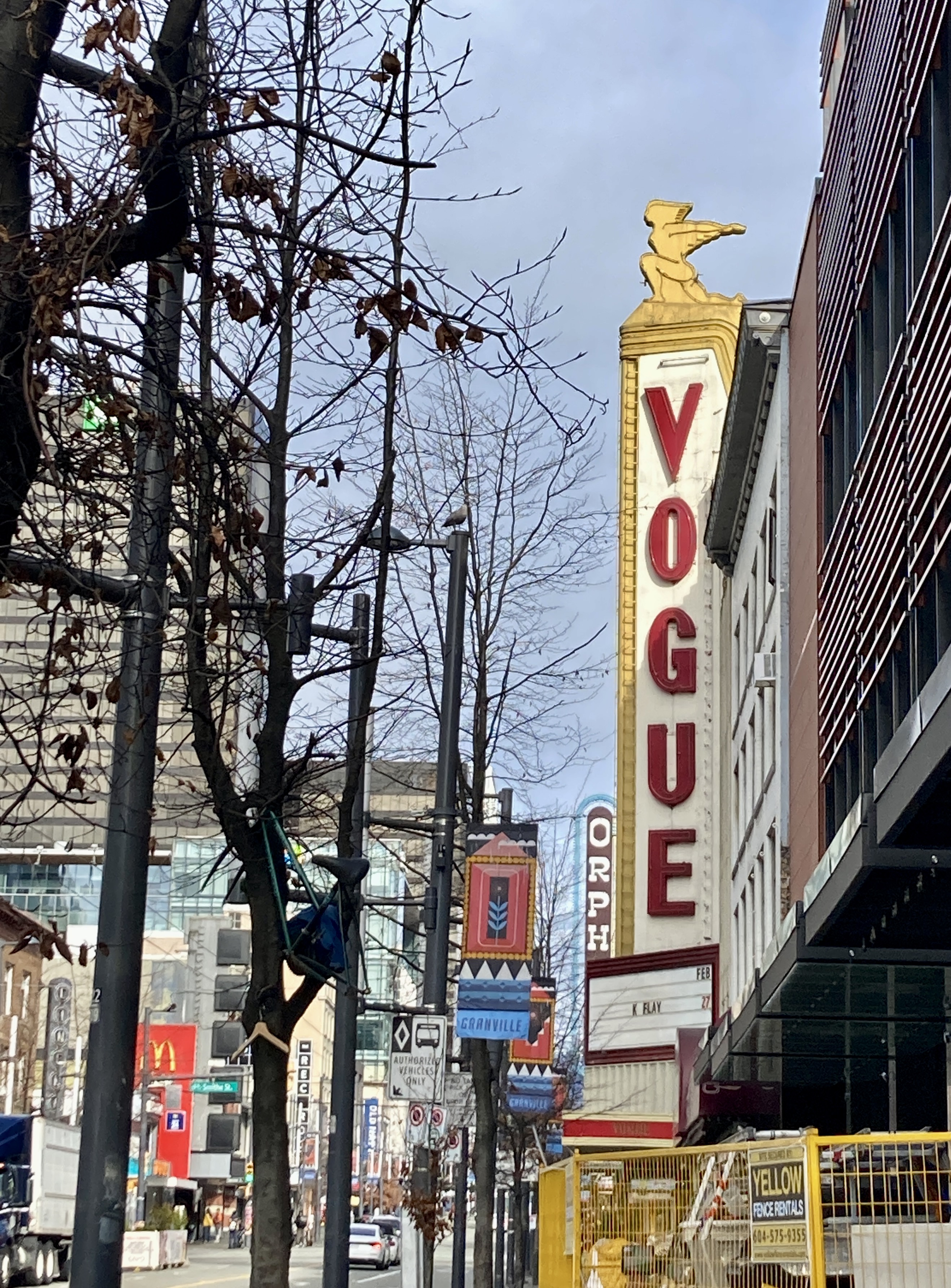 Left on Nelson, right on Granville, and I’m up against the busy construction work beneath one of the street’s stubborn theatrical survivors: the Vogue. It’s a 1941 movie theatre (now event venue), built in Art Deco/Art Moderne style. As you can see.