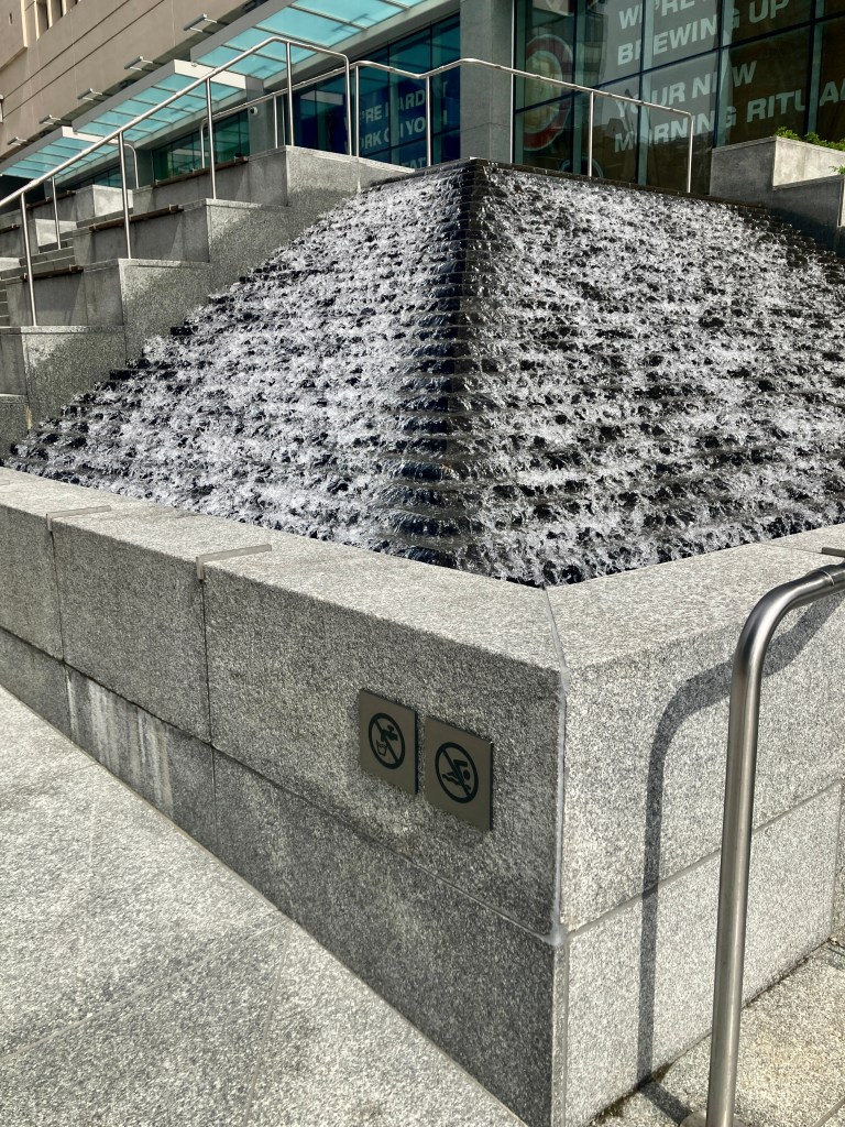 And then I’m past the Del Mar, I’m up at West Georgia, and I’m breathing in the ozone of this fountain that chatter-sparkles one corner of the 1950s Canada Post building, now restored and expanded into The Post, a full city block of offices and glossy shops.