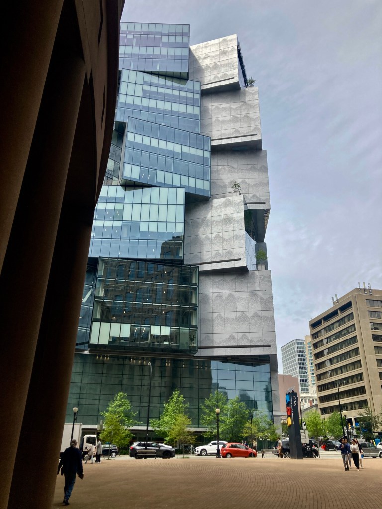 Those bouncy cubes comprise the Deloitte Summit, a 24-storey office tower that opened in fall 2022 and has always struck me with its visual contrast to the rounded, spiralling forms of the library it faces — the 1995 work of Israeli-Canadian-American architect Moshe Safdie, a building lauded by Travel + Leisure magazine as one of the world’s “Beautiful Libraries.” (Up there with the Bodleian, in Oxford; the Library of Trinity College, in Dublin; the Stuttgart City Library, in Stuttgart; and the Bibliothèque Interuniversitaire de la Sorbonne, in Paris.)