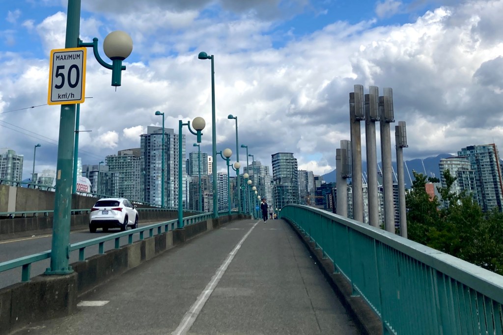 Panoramic views of grey & green as I near the north end of the bridge, with parkland and trails either side of False Creek, framed by city buildings beyond.