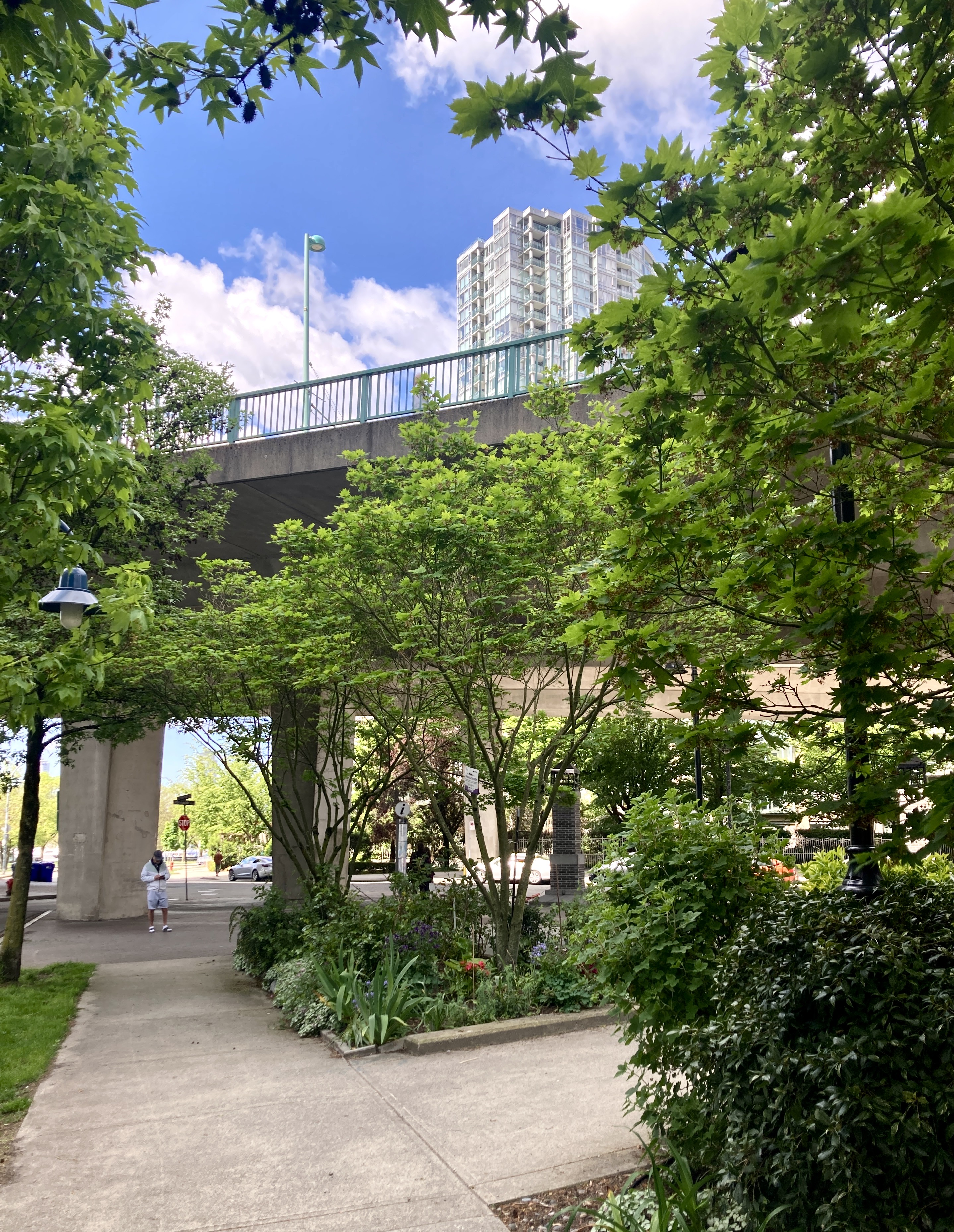 All the entangled grey & green of a city. Grey, the hardscape of human construction; green, persistent nature; also “green,” human intervention meant to enhance nature, and co-exist rather than simply dominate.