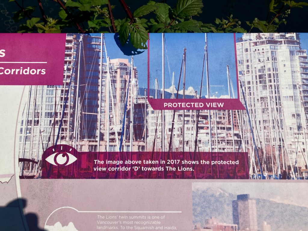 The Seawall itself invites time travel. At the appropriate spot, signage shows us the unobstructed 2017 view across the water and through the city, right up to The Lions (two iconic mountain peaks, now more often called The Twin Sisters). It is, the signage announces, a protected view.