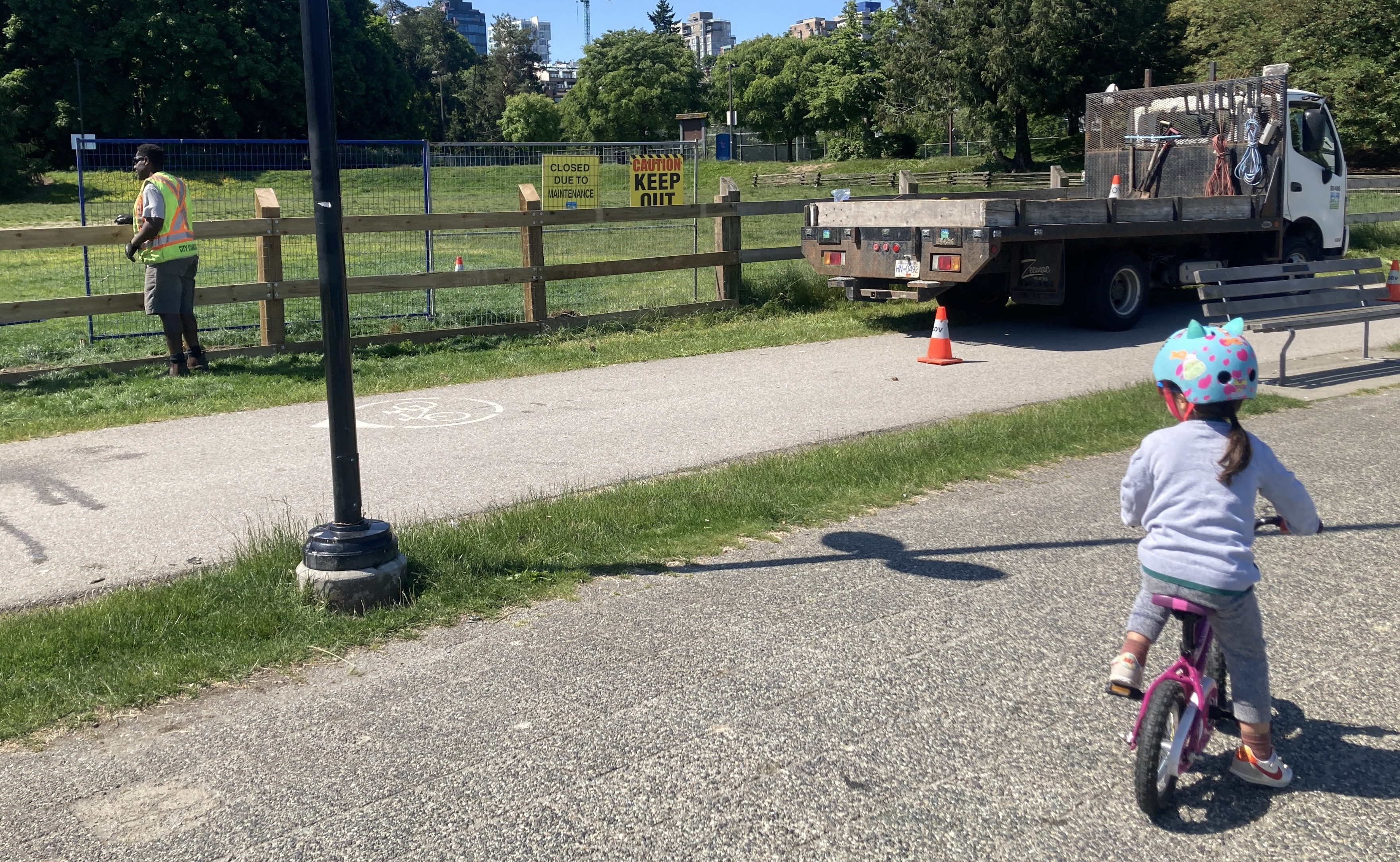 From elderly to young, from sturdy trishaw to tiny bicycle: Polkadot Helmet Missy & I pause halfway through Charleson Park…