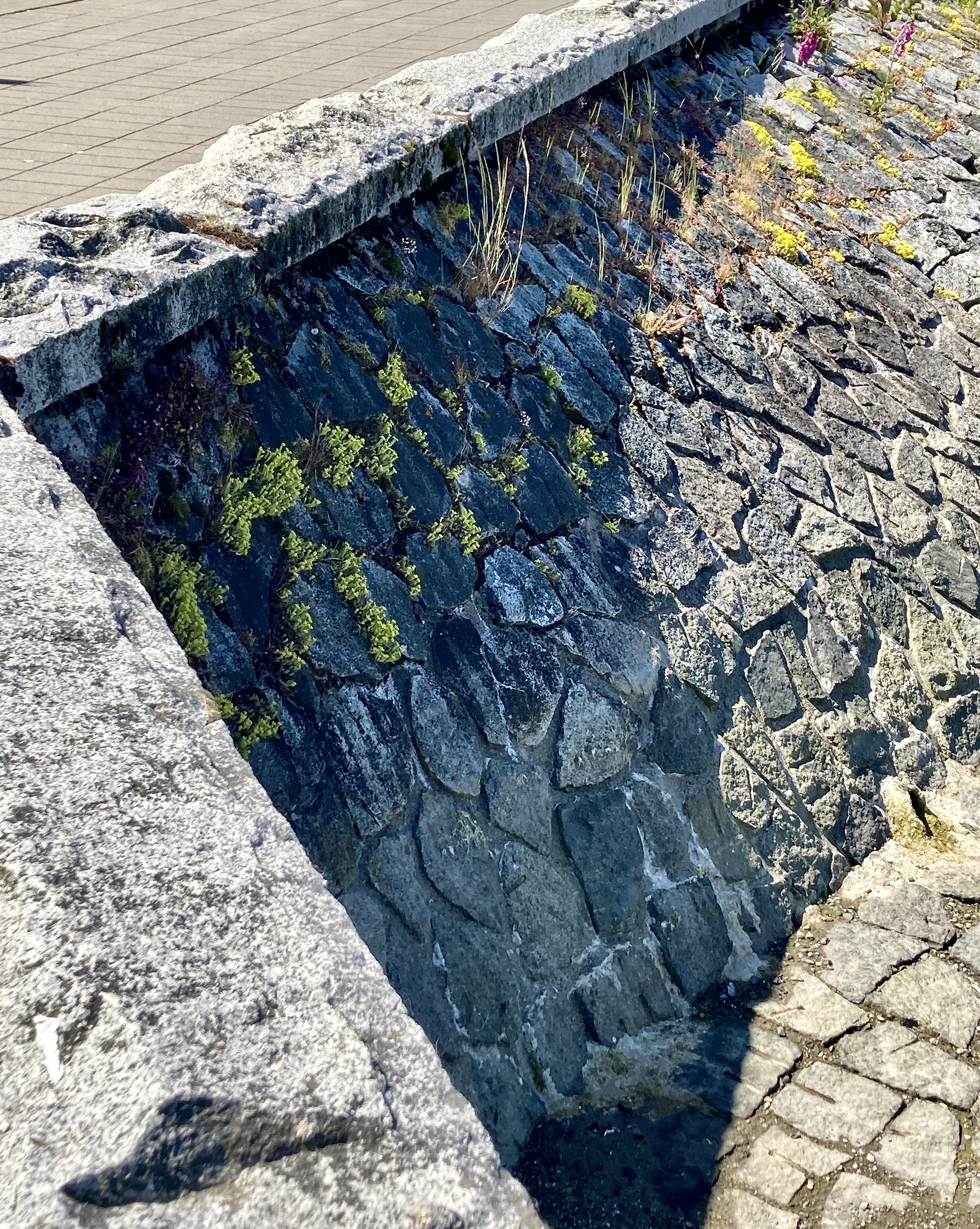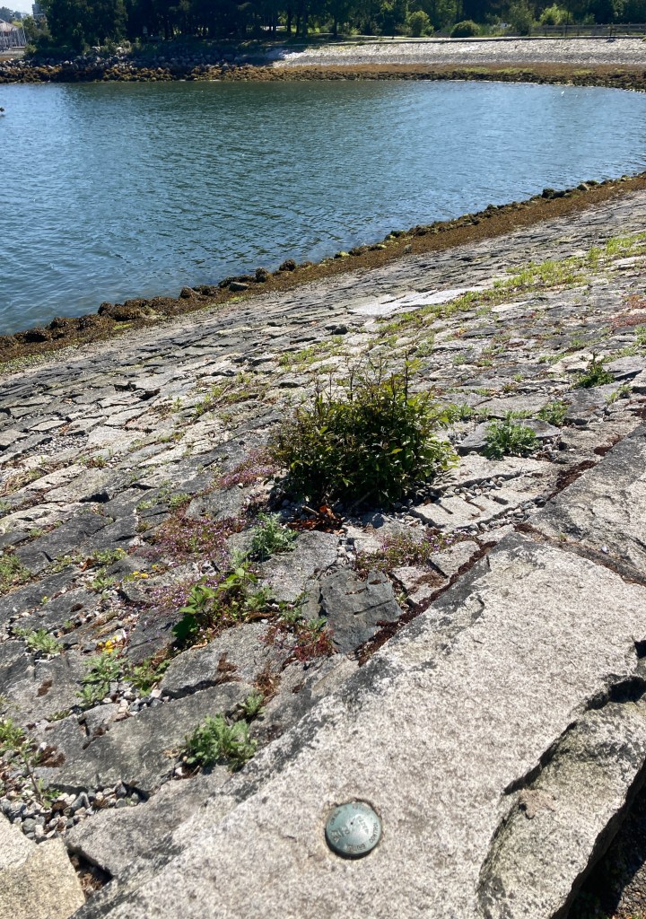 and I, initially taking in yet another sweep of vegetation, suddenly notice a tiny turquoise medallion, set in the Seawall ledge.