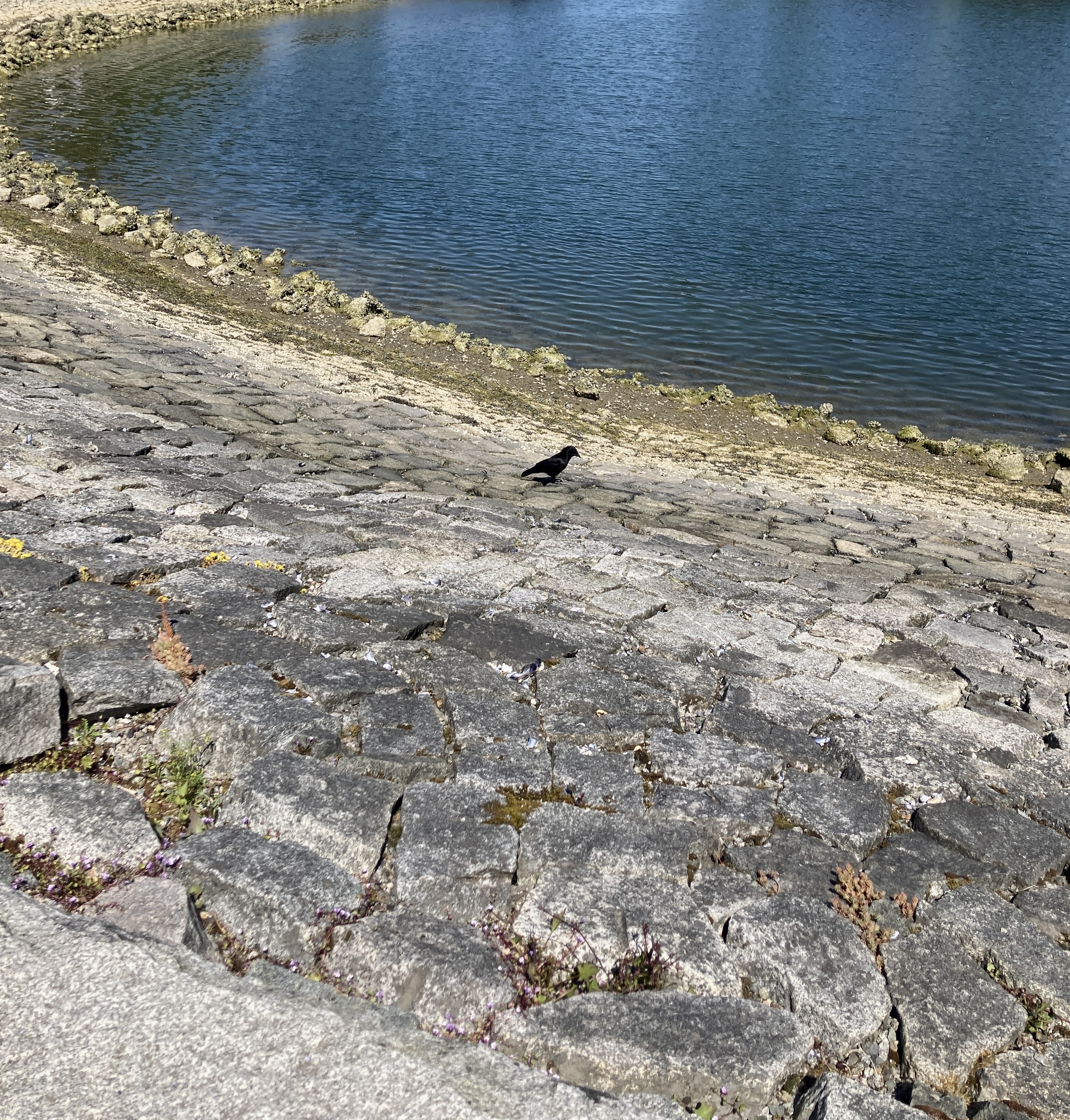 and my mind bounces off most of what I see. Bounces off the low tide, the prow of a boat, the Seawall pathway, the bench in the bend of that pathway, and the collection of blue café umbrellas in Leg in Boot Square just ahead. My mind lands squarely on all that rock.