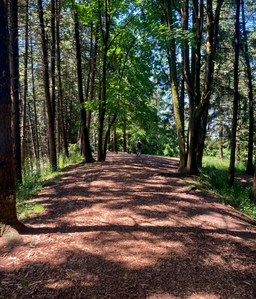 The high route, this time, not the Seawall. It climbs me into the upper elevations of Charleson Park, all forest and dappled bark-chip trails…
